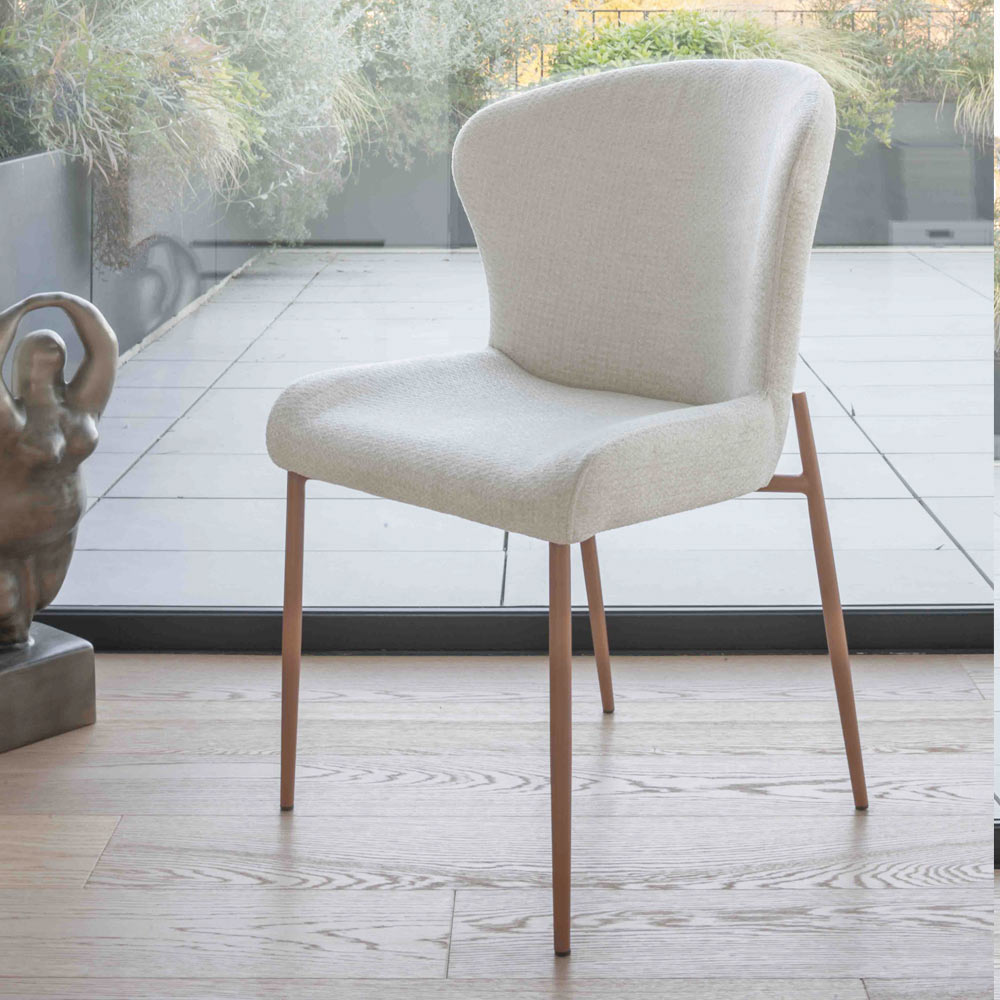 Questa sedia è un perfetto incontro tra comfort avvolgente design sofisticato, ideale per ambienti moderni dal gusto raffinato. La seduta imbottita lo schienale curvo offrono un sostegno ergonomico che invita al relax, mentre il rivestimento tessuto aggiunge un tocco di luminosità morbidezza alla stanza. Le gambe metallo verniciato, dal profilo sottile armonioso, creano un elegante contrasto la texture del tessuto, esaltando la leggerezza la contemporaneità del design.