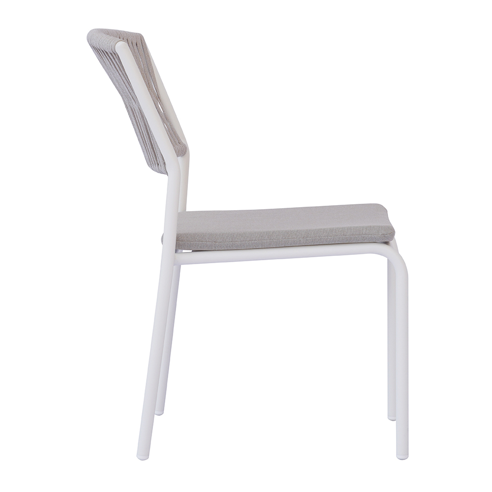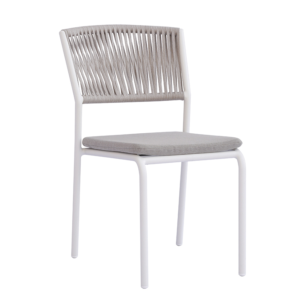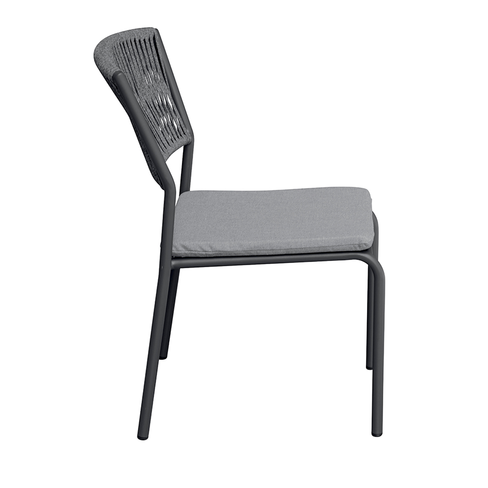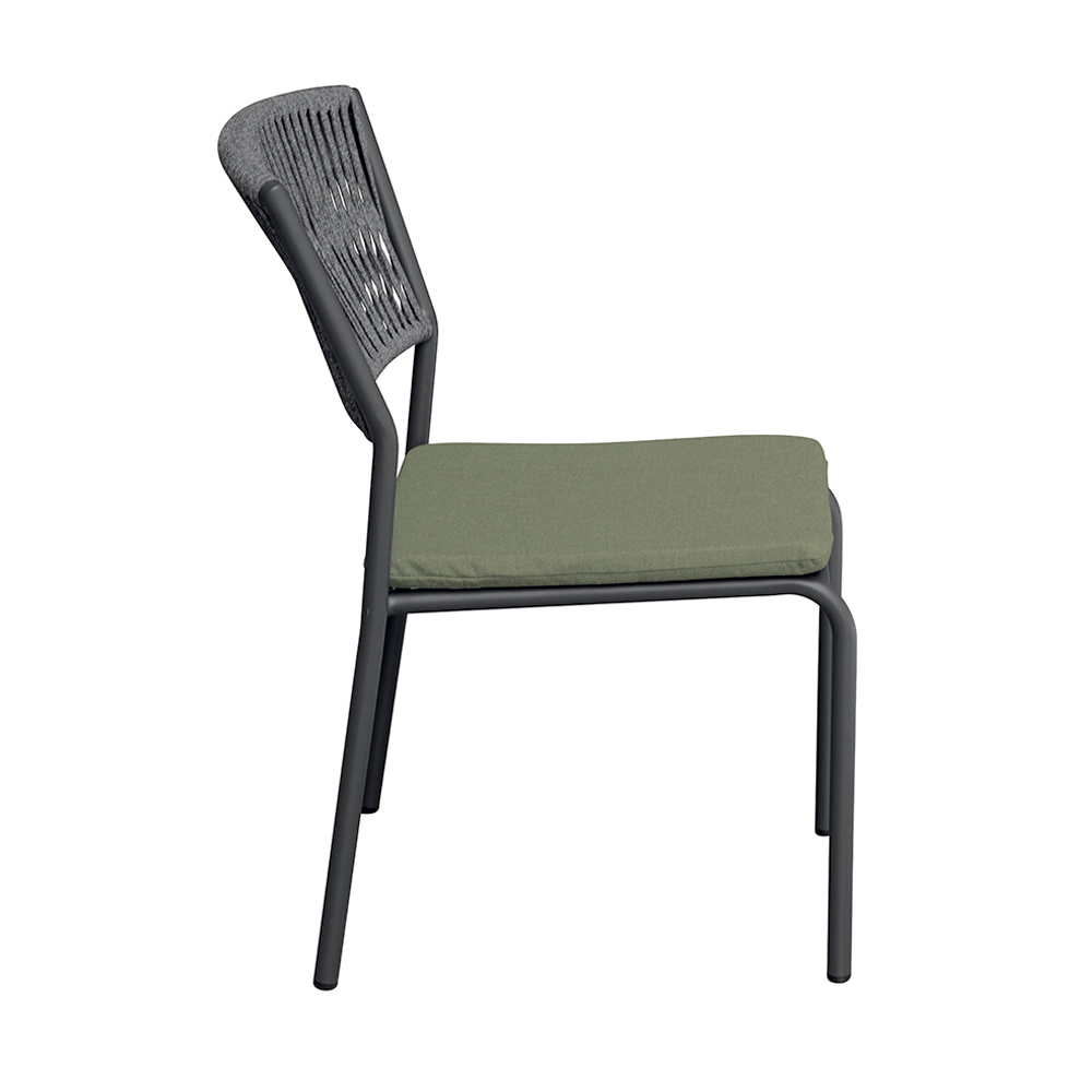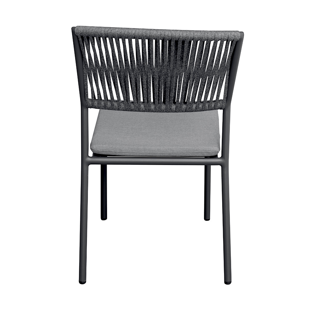 Lo schienale in corda per esterni dona un tocco raffinato e contemporaneo, assicurando comfort e traspirabilità, mentre la seduta in alluminio con cuscino coordinato offre morbidezza e comodità, rendendo ogni momento di relax ancora più piacevole.