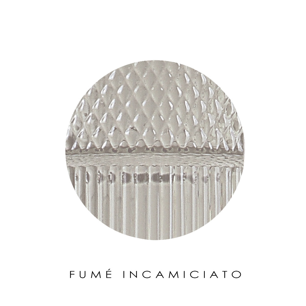 vetro incamiciato o trasparente con lavorazione rigata in grado di conferire all'ambiente circostante un tocco di ricercata eleganza insieme a giochi di luce dall'affascinante effetto visivo.
