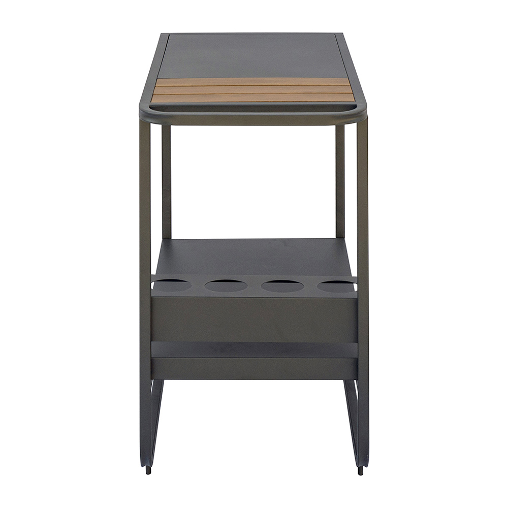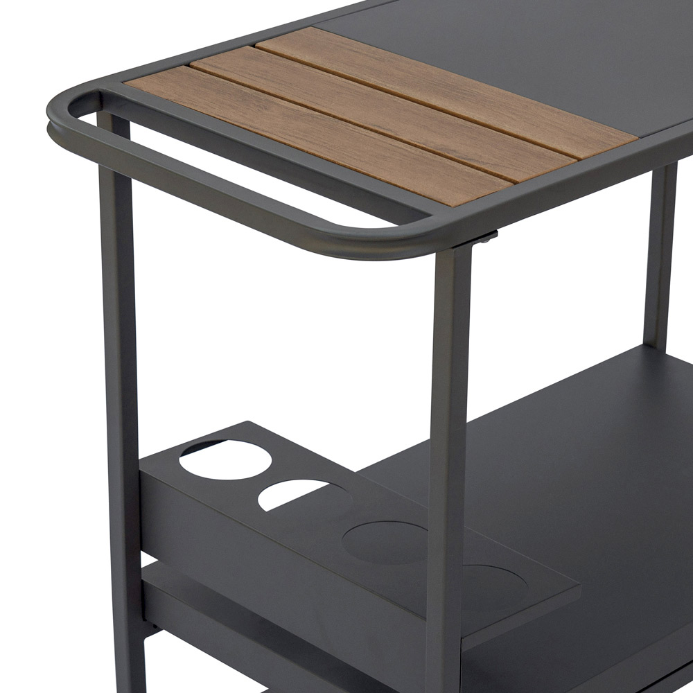 Il piano superiore con dettagli in resin wood dona un tocco caldo e naturale al design moderno della struttura, creando un piacevole contrasto estetico. Il ripiano inferiore e il portabottiglie integrato offrono spazio extra per organizzare bevande, bicchieri e accessori, rendendo questo carrello un alleato perfetto per pranzi, aperitivi o cene all’aperto.