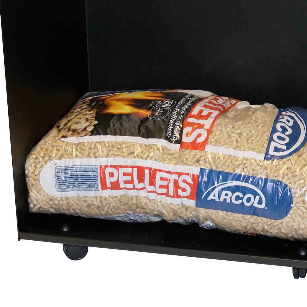 Questo carrello porta sacchi pellet è un oggetto pratico e progettato per facilitare la gestione e lo stoccaggio del combustibile per il tuo camino o stufa a pellet. Il design robusto e la finitura nera si integrano con discrezione in qualsiasi ambiente domestico, offrendo un'estetica pulita che non compromette la funzionalità.