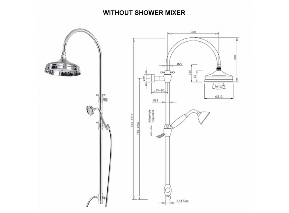 Colonna doccia in ottone con soffione e doccetta design classico, alta qualità Made in Italy.