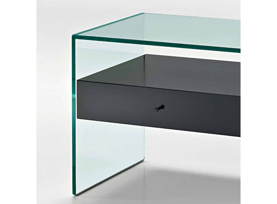 Comodino di design moderno in vetro extrachiaro con cassetto in legno, prodotto artigianalmente in Italia.