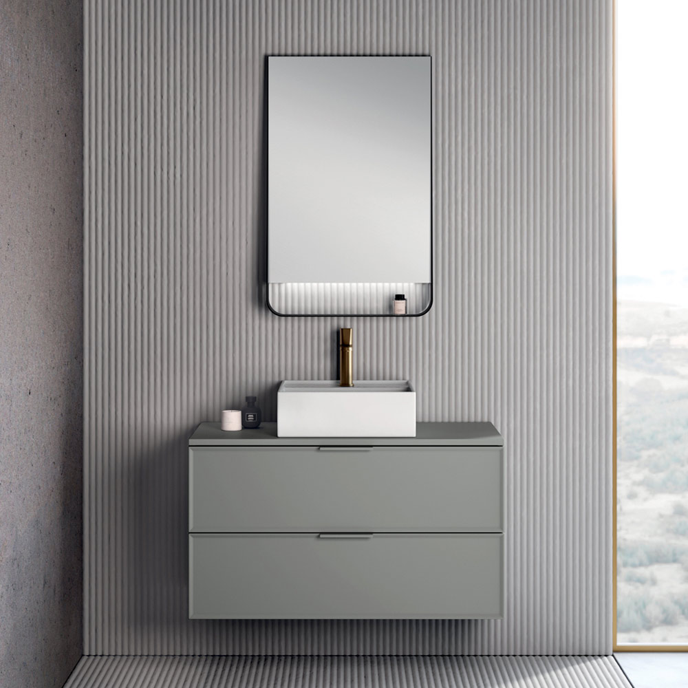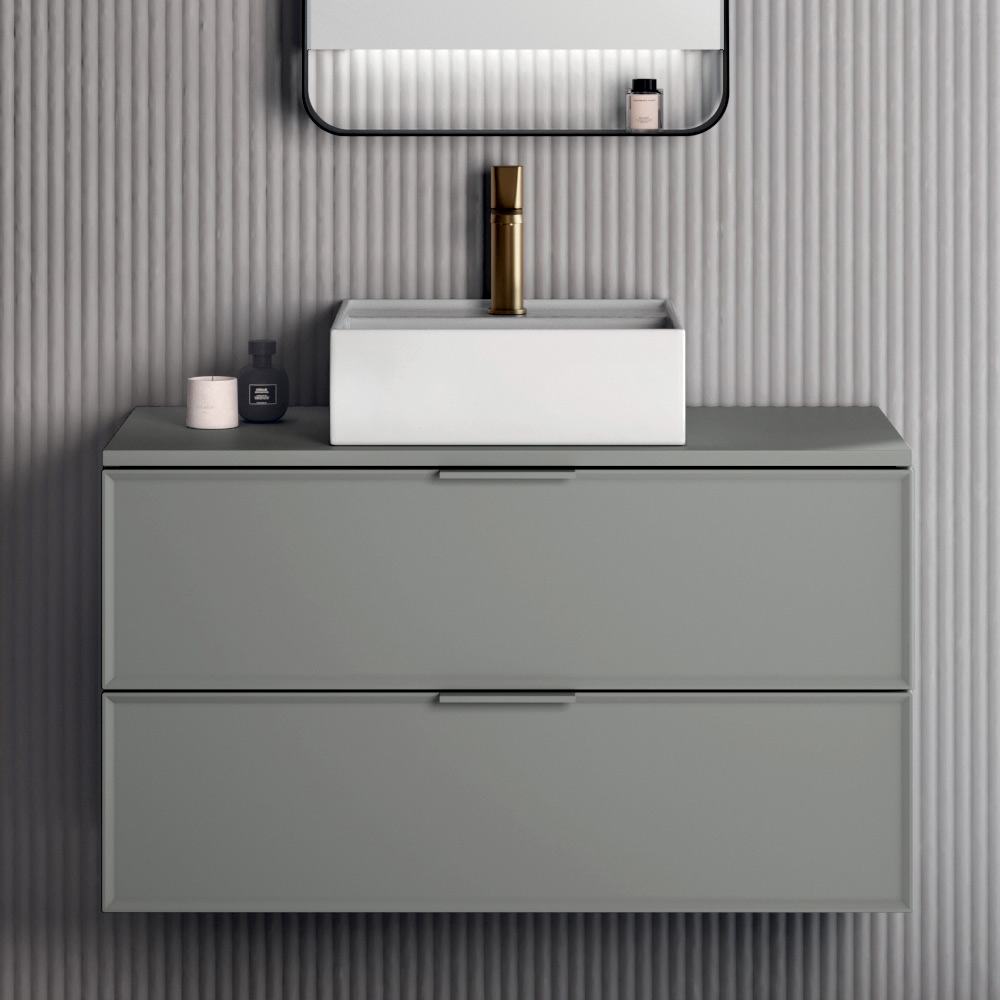 Raffinata composizione bagno moderna dal carattere essenziale ed elegante, ideale per ambienti contemporanei e minimali. La finitura grigio opaco conferisce sobrietà e versatilità, adattandosi con facilità a diversi stili di interior design.