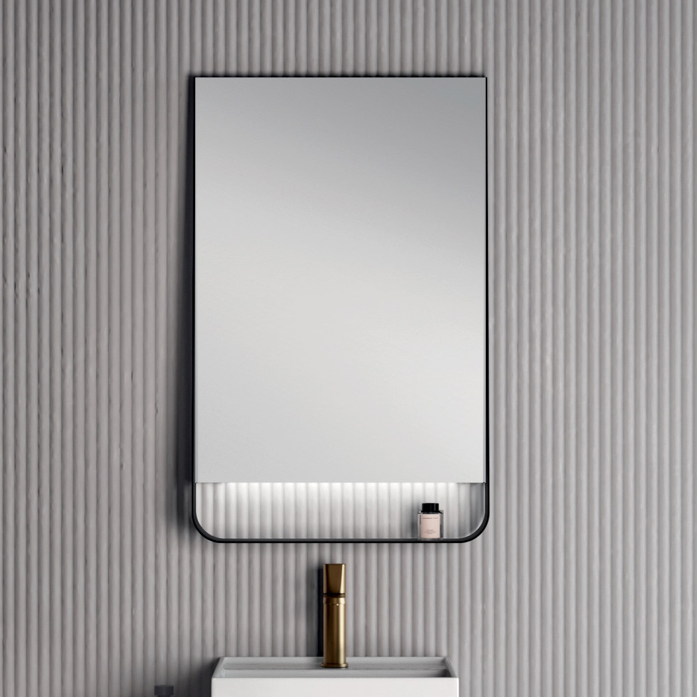 Completa l’insieme lo specchio bagno LED Wing con cornice nero opaco, un elemento di forte personalità che assicura un’illuminazione funzionale e allo stesso tempo decorativa, valorizzando l’intera area lavabo.