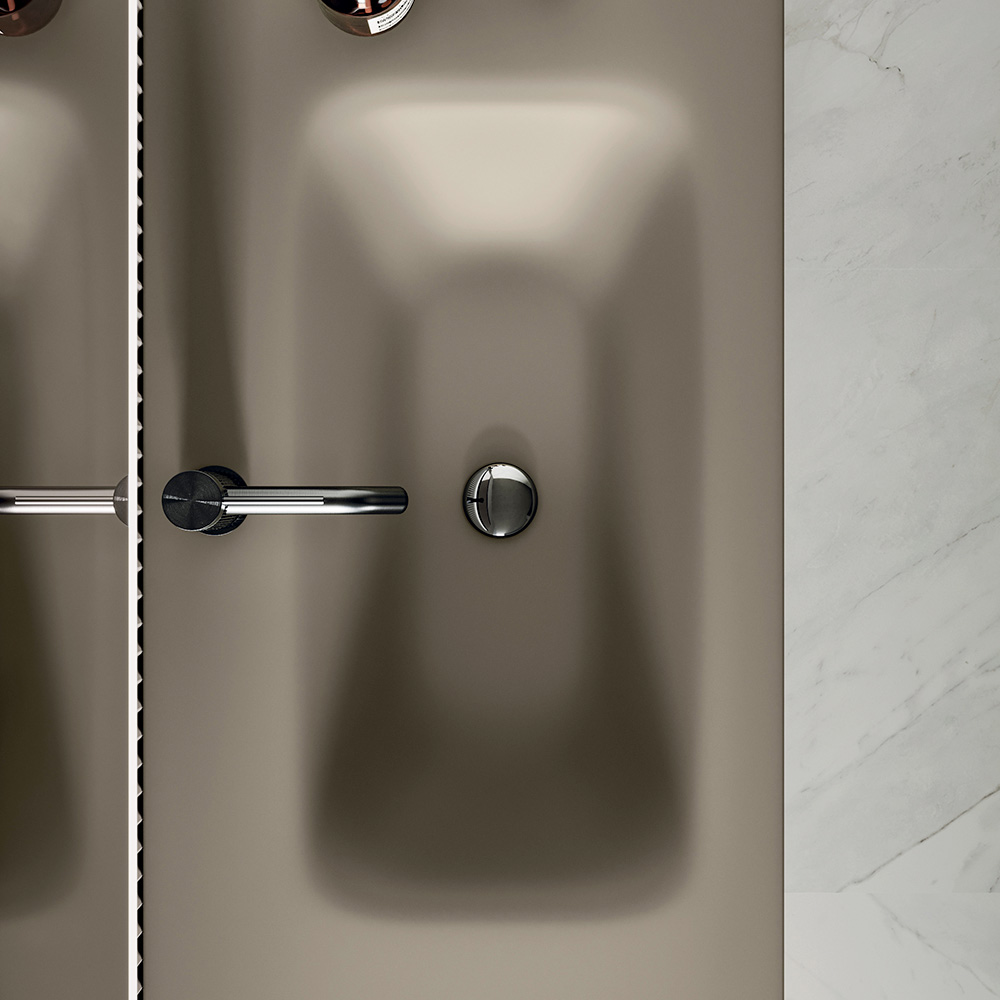 Il lavabo in vetro satinato nella tonalità tortora crea un raffinato gioco tono su tono con la base, esaltando la leggerezza visiva dell’intera composizione e donando luminosità alla zona lavabo.