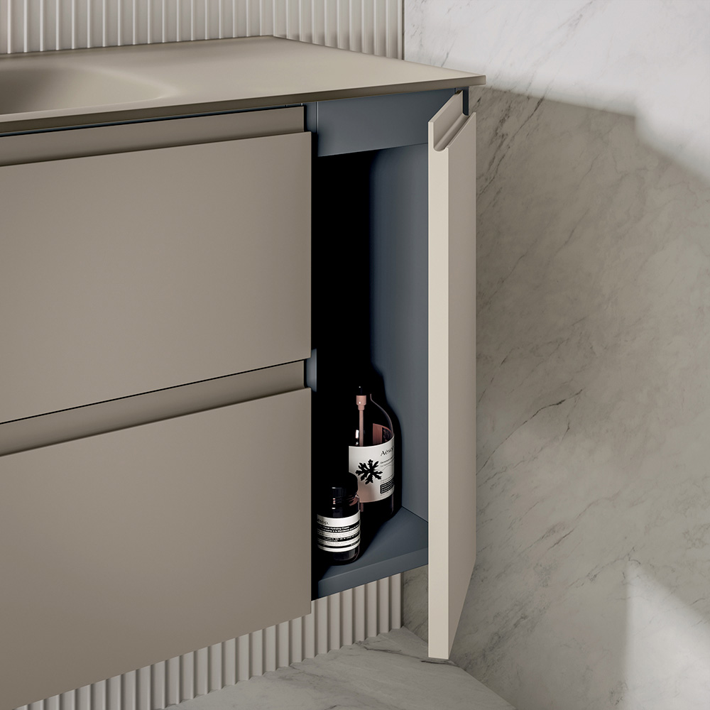 La base cm con due cassetti e anta laterale destra in finitura tortora opaco offre un’ampia capacità contenitiva, mantenendo un’estetica raffinata e contemporanea. La configurazione con anta integrata garantisce maggiore funzionalità e organizzazione dello spazio interno.