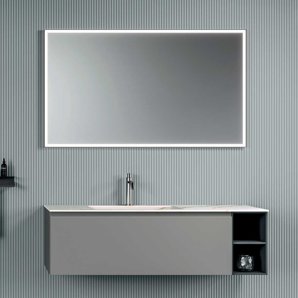 Completa la composizione lo specchio LED retroilluminato, studiato per offrire una luce uniforme e avvolgente, perfetta per valorizzare lo spazio bagno e garantire un’illuminazione funzionale ed elegante.