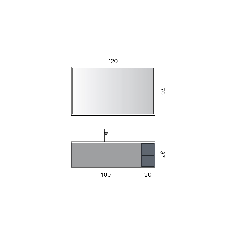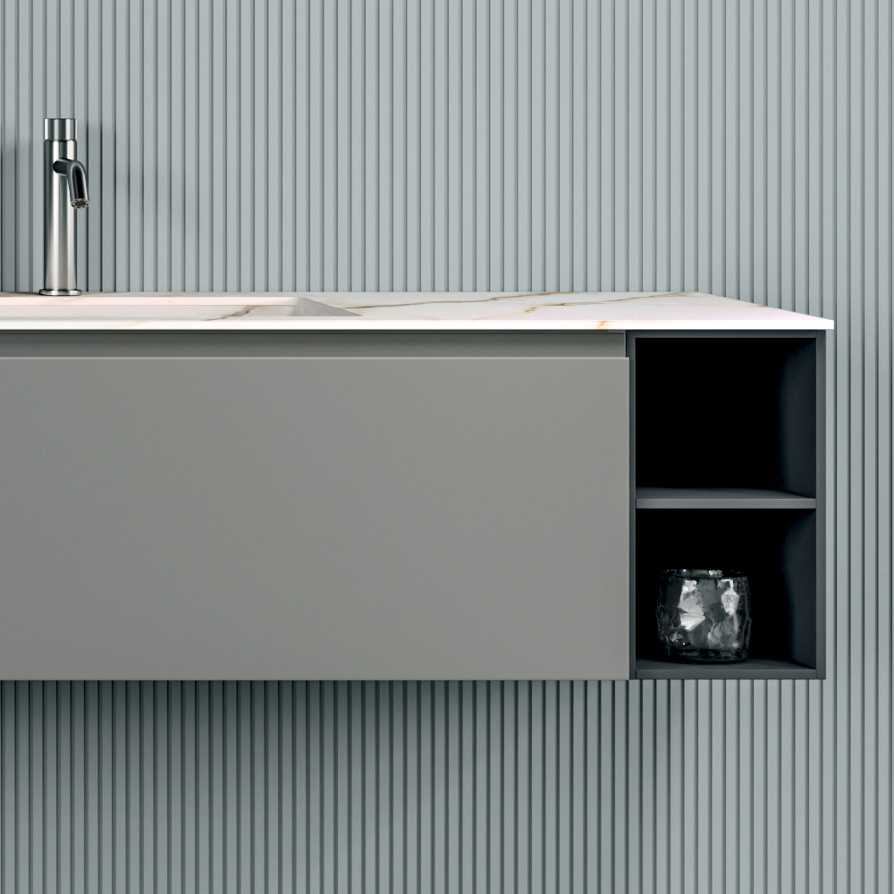 La base sospesa con ampio cestone, proposta nella finitura grigio opaco, garantisce una capiente soluzione contenitiva mantenendo un’estetica essenziale e ordinata.