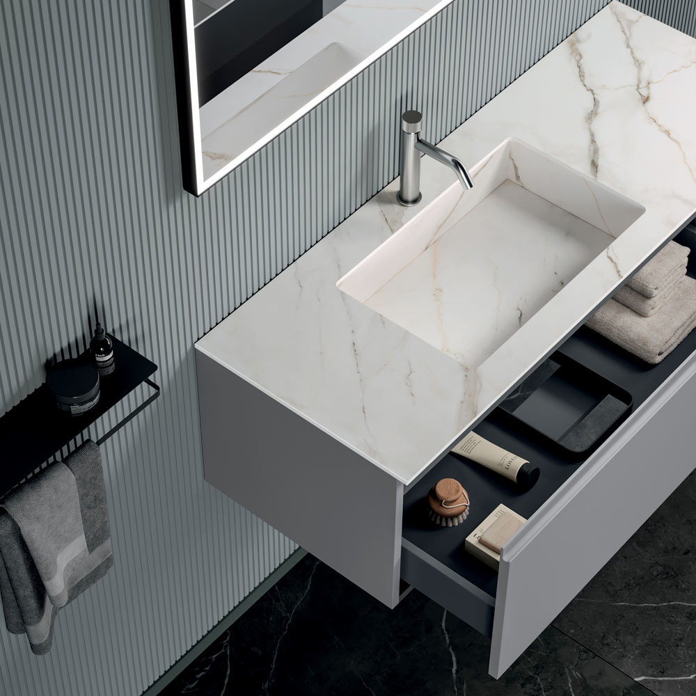 Il top lavabo integrato in gres Calacatta Gold rappresenta il cuore estetico della composizione. Le venature eleganti e luminose richiamano la nobiltà del marmo, offrendo al tempo stesso resistenza, praticità e facilità di manutenzione.