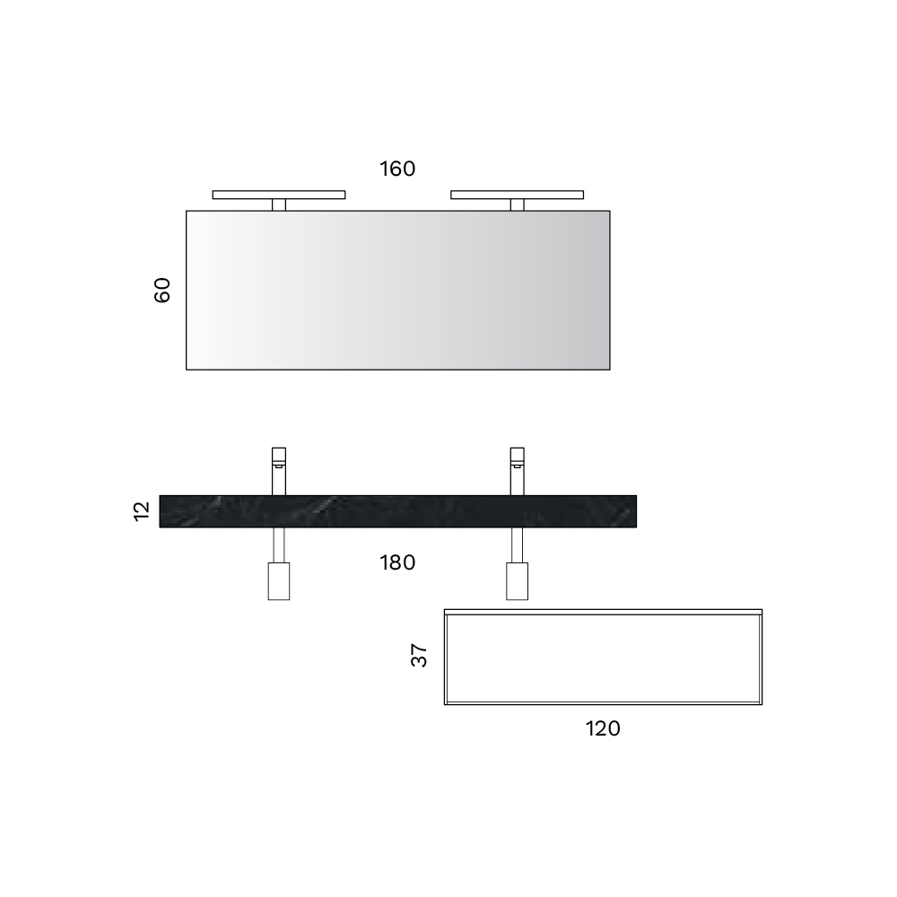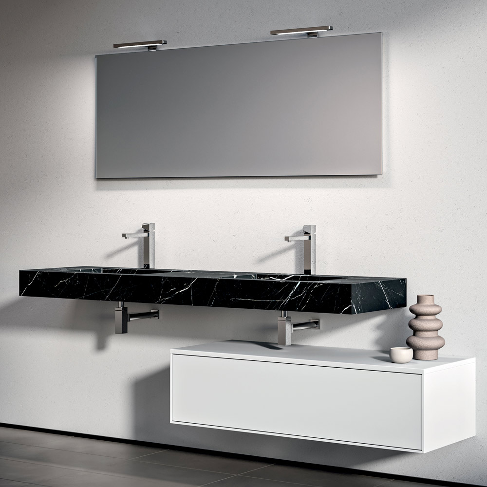 Una composizione bagno scenografica e contemporanea, pensata per ambienti ampi e sofisticati. Il top con doppia vasca in HPL effetto Marquina dona carattere e profondità visiva, creando un raffinato contrasto con la base in bianco opaco.