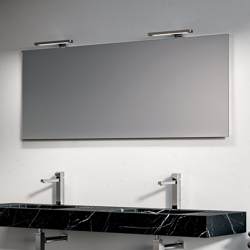 Lo specchio retroilluminato amplia visivamente l’ambiente e diffonde una luce uniforme e avvolgente, completato da eleganti lampade LED cromate che aggiungono un tocco luminoso e contemporaneo.