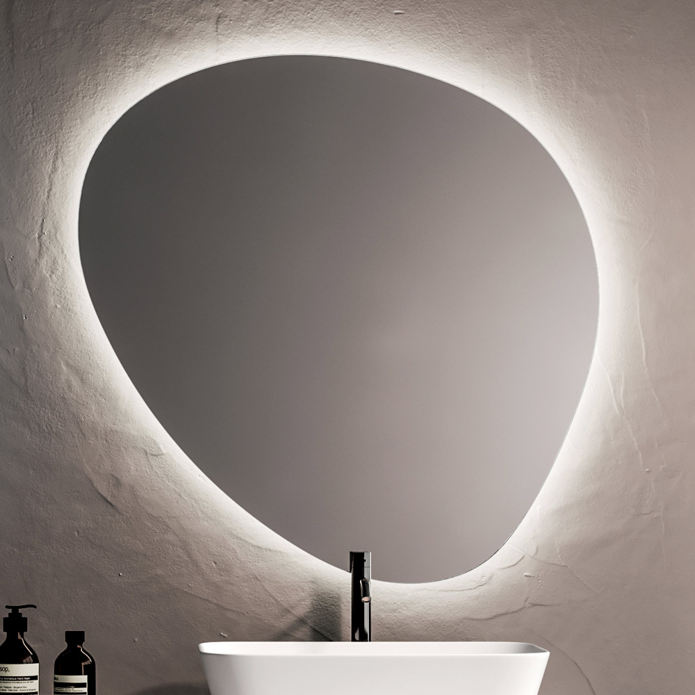 Protagonista della composizione è lo specchio LED sagomato, che diffonde una luce morbida e avvolgente lungo il perimetro, valorizzando lo spazio bagno e creando un’atmosfera elegante e rilassante. L’illuminazione integrata migliora il comfort visivo e accentua il carattere contemporaneo dell’ambiente.