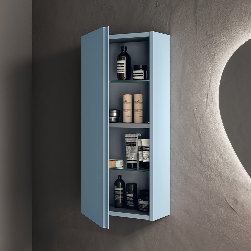 Completa l’insieme il pensile coordinato color tiffany, ideale per ampliare la capacità contenitiva senza appesantire la composizione, mantenendo una coerenza estetica raffinata e minimal.