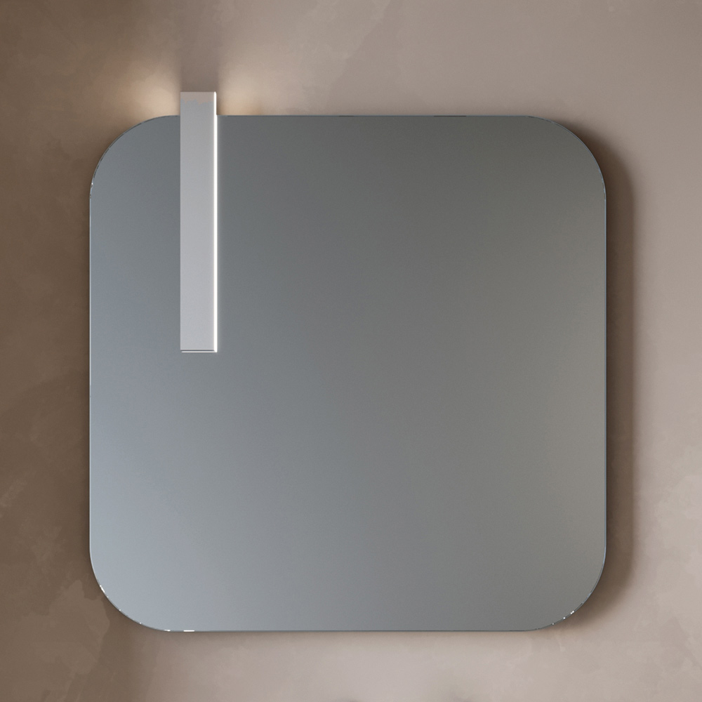 Lo specchio sagomato aggiunge carattere e personalità alla composizione, mentre la lampada LED con finitura cromata garantisce un’illuminazione elegante e funzionale, ideale per la zona lavabo.