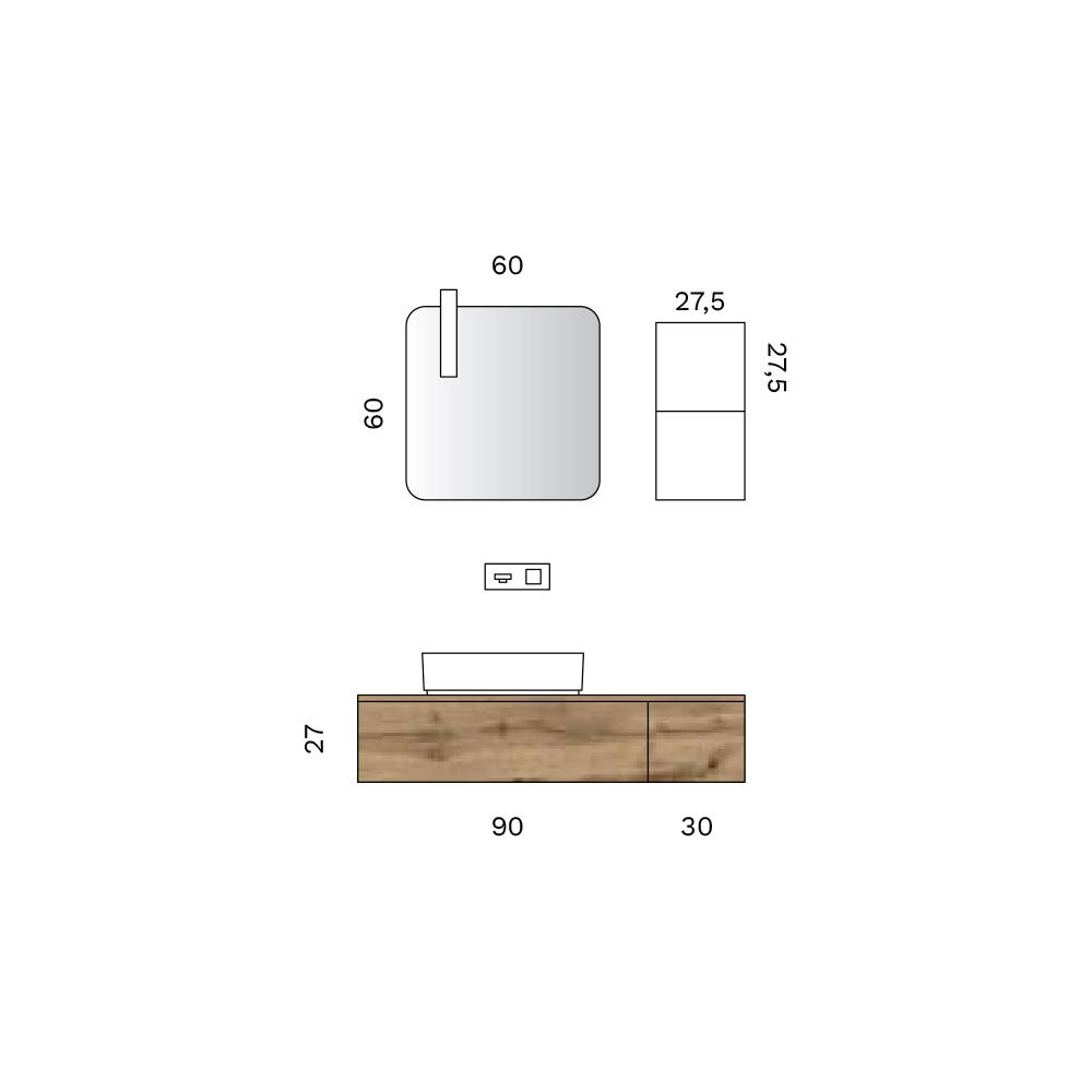 La struttura è composta da basi sospese con cassetto, progettate per garantire una gestione funzionale dello spazio e una perfetta organizzazione degli accessori. L’integrazione del sifone mantiene una linea pulita e minimale, esaltando l’equilibrio formale dell’insieme.