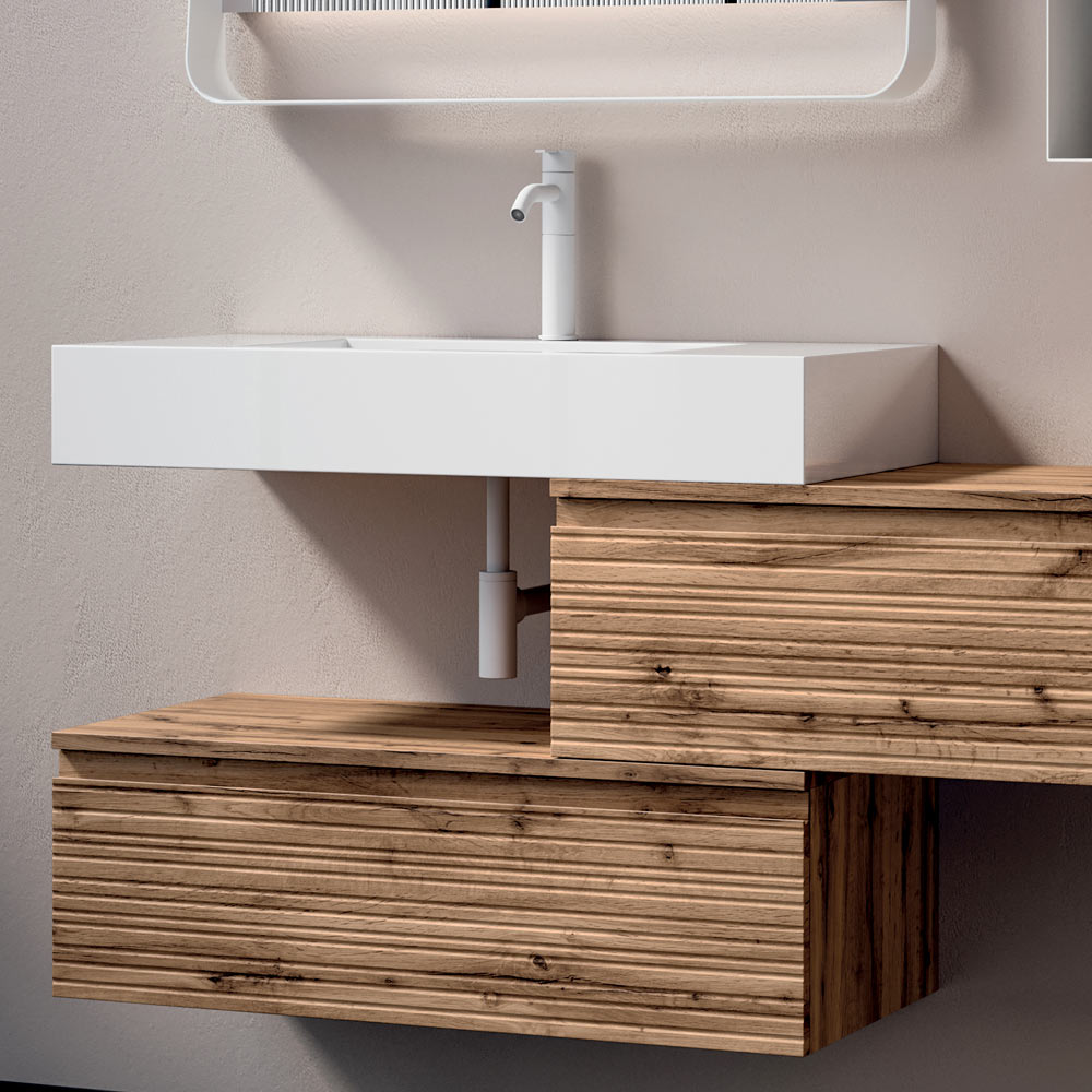 Il top lavabo in bianco lucido illumina l’ambiente e crea un raffinato contrasto con il legno, offrendo una superficie resistente, facile da pulire e pensata per l’uso quotidiano.