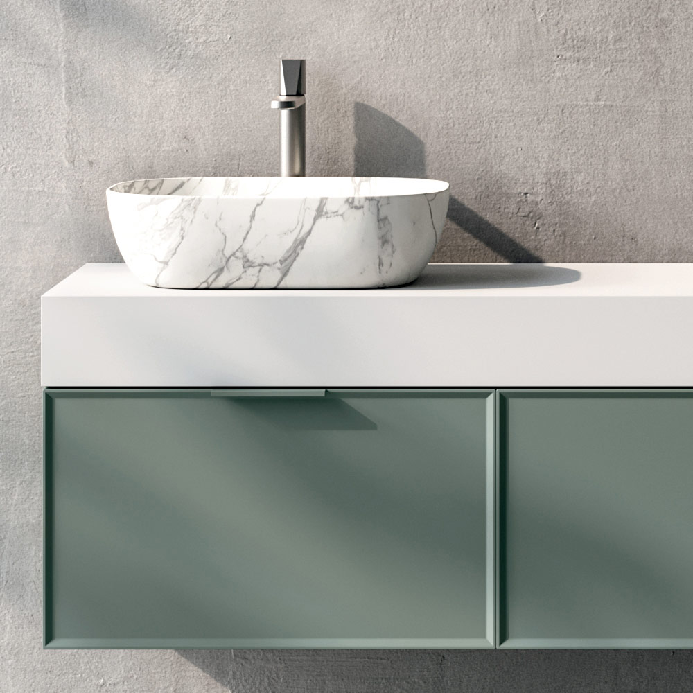 Elegante composizione bagno di design contemporaneo, pensata per ambienti raffinati e moderni. Il mix tra finitura salvia opaca, superfici chiare e dettagli luminosi crea un’atmosfera equilibrata, rilassante e di grande impatto estetico.