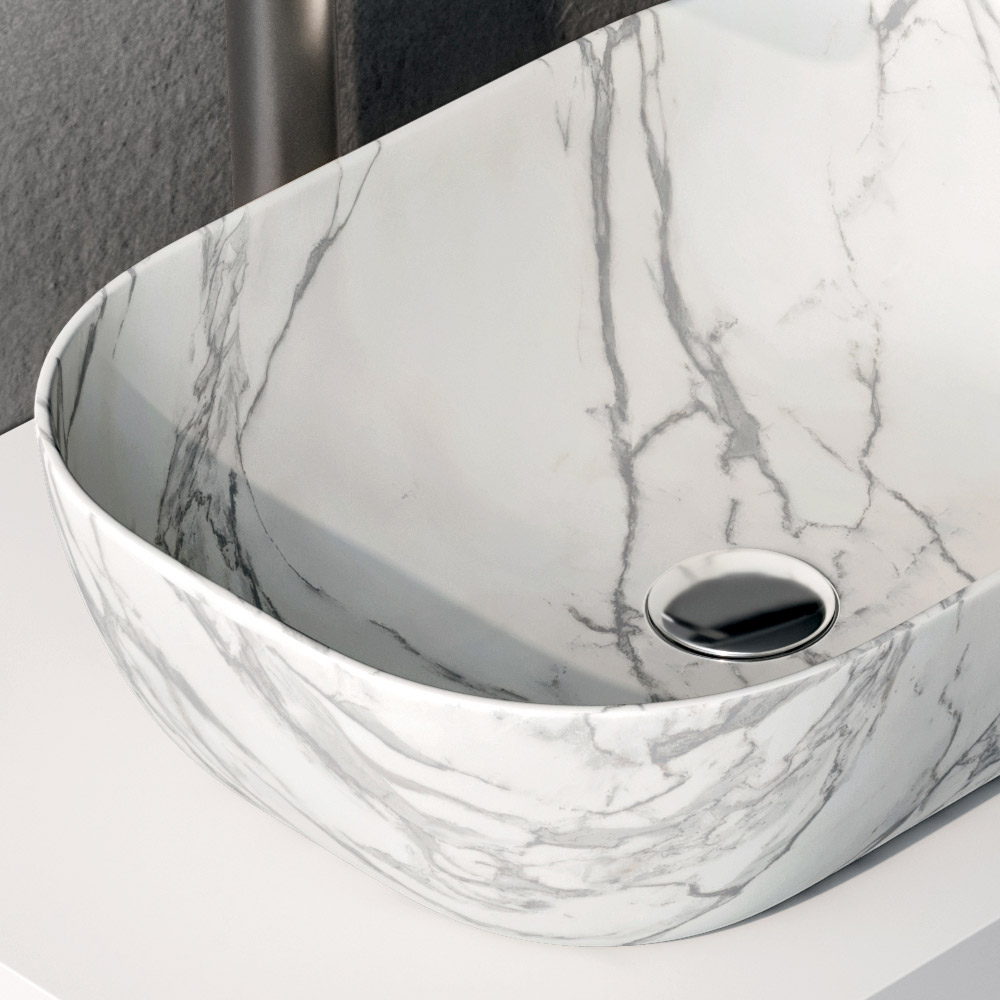 Il top lavabo bianco opaco accompagna armoniosamente il lavabo in ceramica effetto Calacatta, caratterizzato da una superficie luminosa e da venature delicate che richiamano il marmo, valorizzando l’intera composizione.