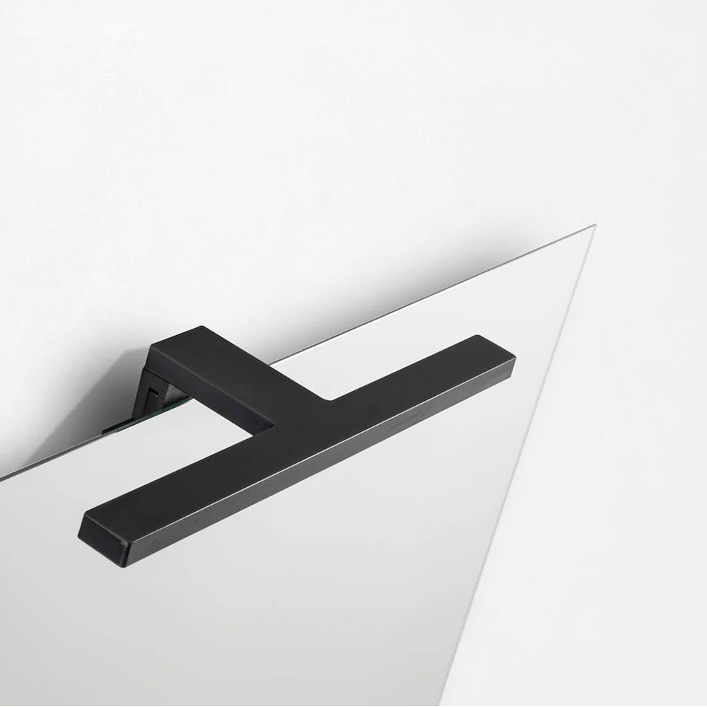 La lampada LED nera completa la composizione con un accento grafico deciso, offrendo un’illuminazione funzionale e scenografica, ideale per creare un’atmosfera intima e sofisticata nella zona lavabo.