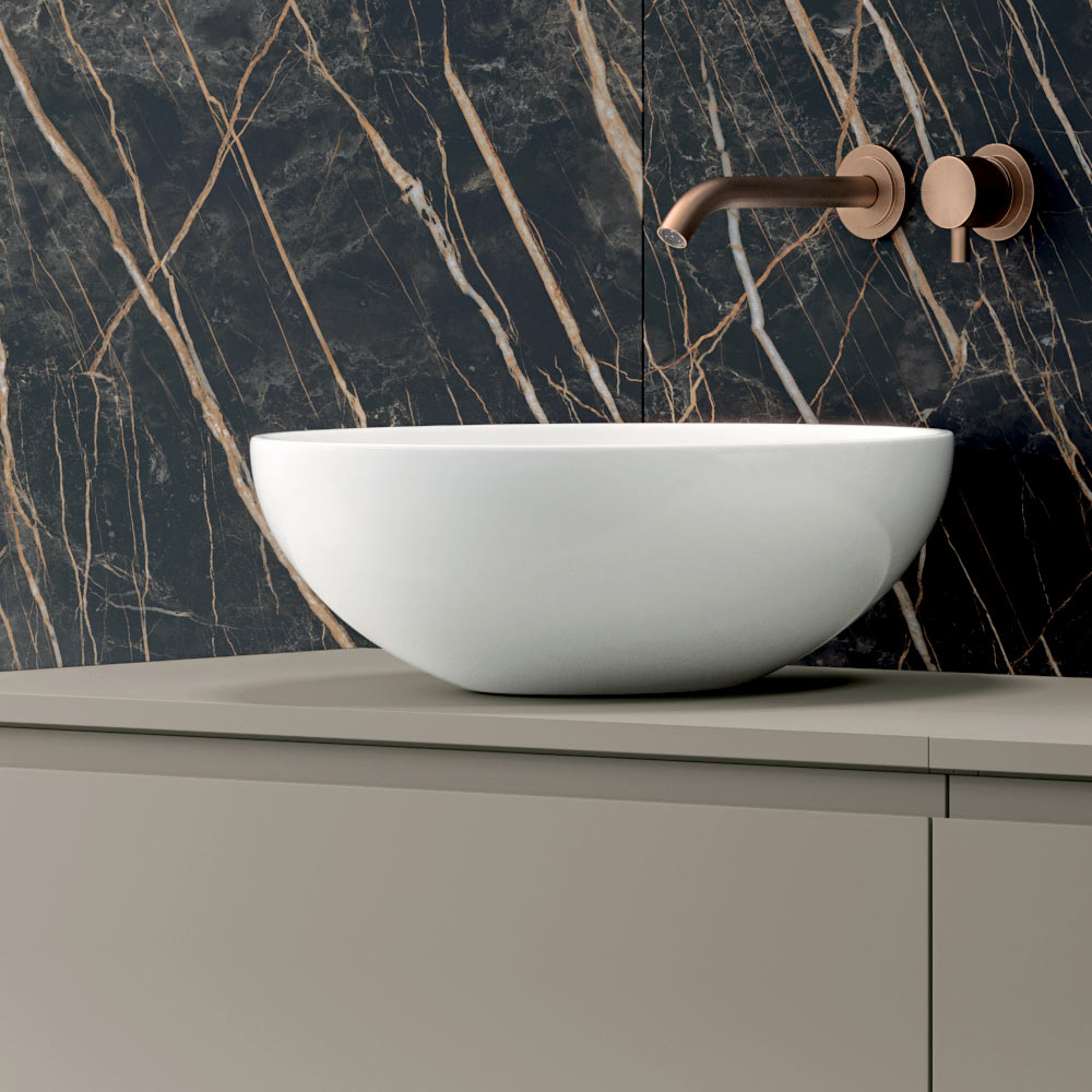 I 2 lavabi da appoggio in ceramica bianco lucido, dalle forme essenziali e armoniose, garantiscono comfort d’uso quotidiano e un’elevata praticità di pulizia, offrendo allo stesso tempo un forte valore estetico. La configurazione con doppio lavabo rende la composizione ideale per bagni padronali o ambienti condivisi.