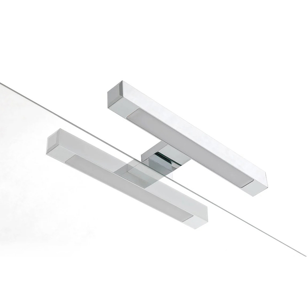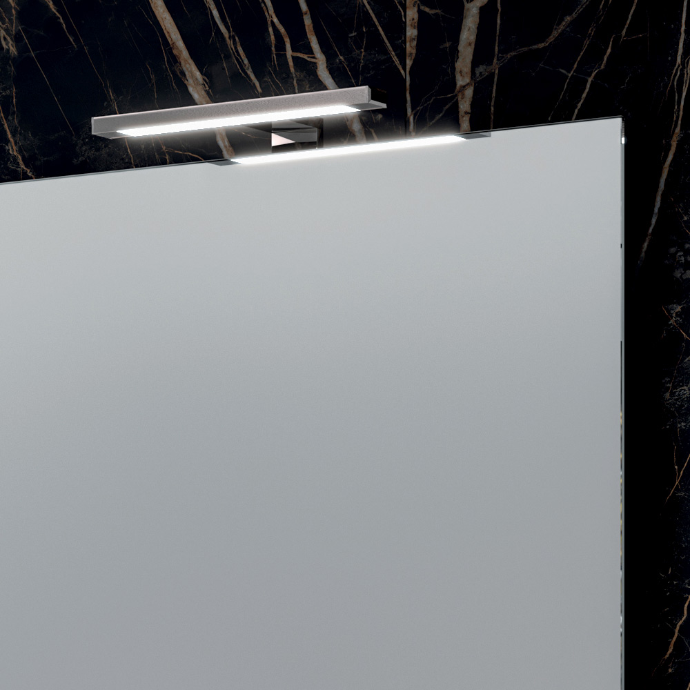 Lo specchio rettangolare amplifica la luminosità e dona profondità allo spazio, mentre le lampade LED con finitura cromata aggiungono un’illuminazione elegante e funzionale, perfetta per valorizzare la zona lavabo.