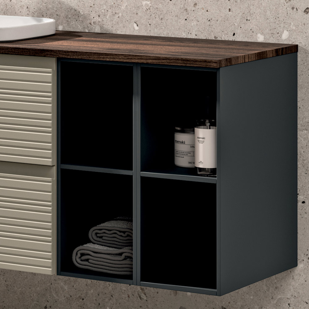 Il top di copertura in rovere rio aggiunge una nota naturale e materica, valorizzando l’insieme con il calore del legno e rafforzando la percezione di qualità artigianale.