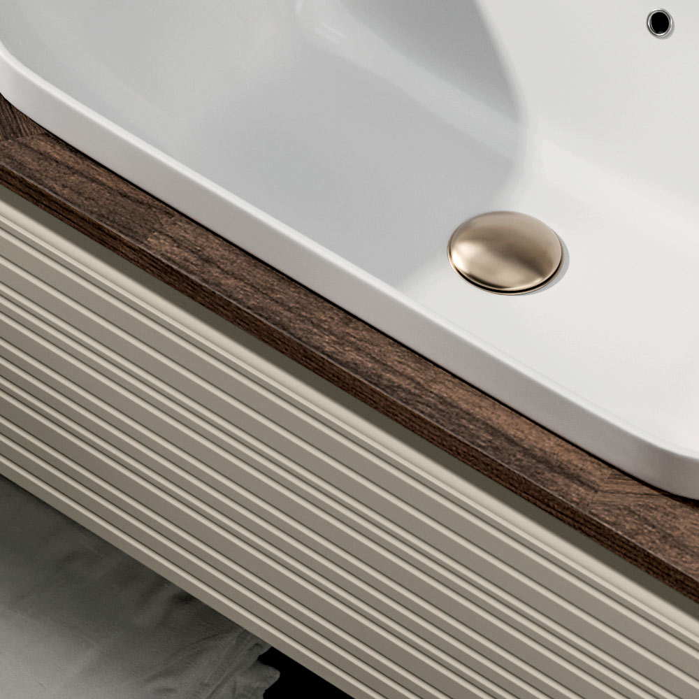 Il lavabo in ceramica bianca, dalle forme pulite ed essenziali, si integra con discrezione nel top, offrendo resistenza, facilità di manutenzione e un’estetica senza tempo.