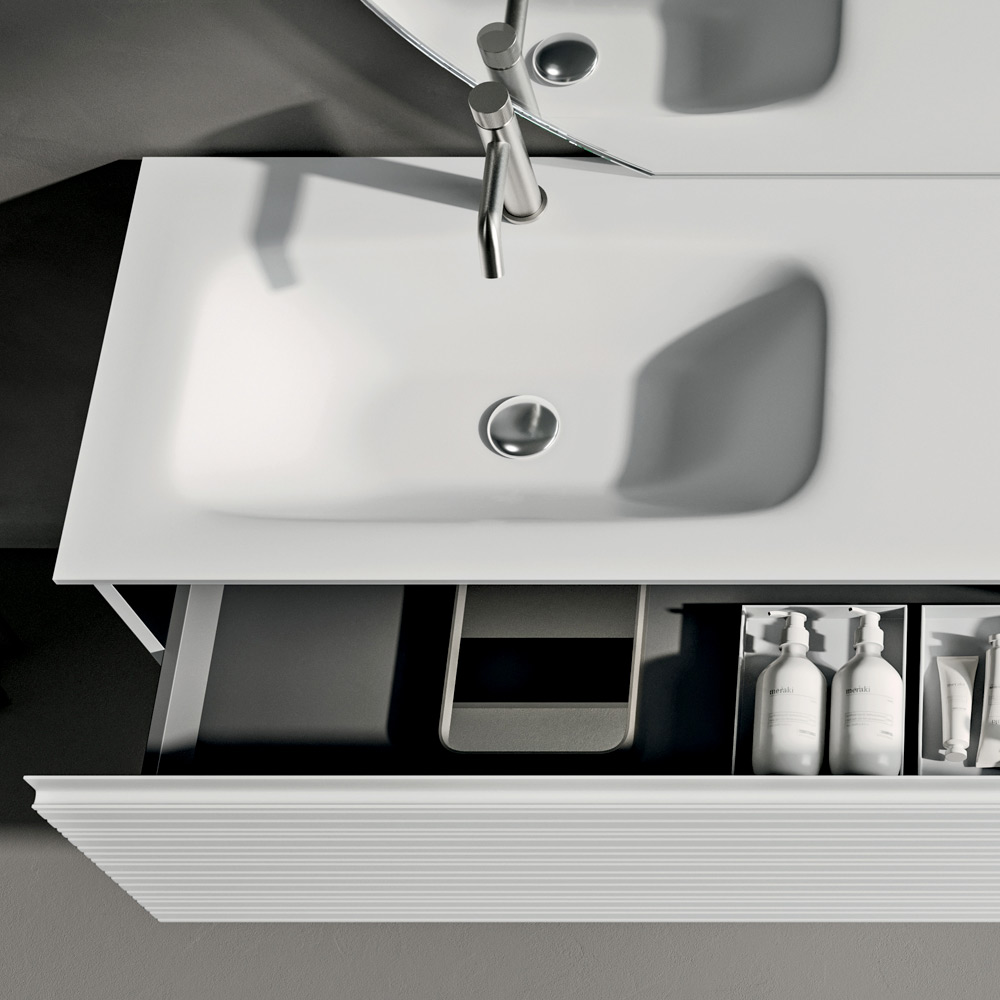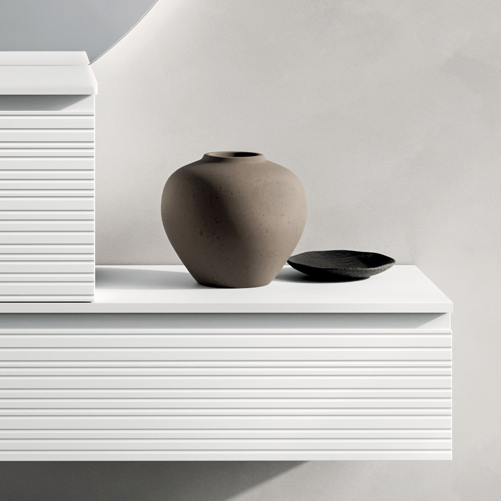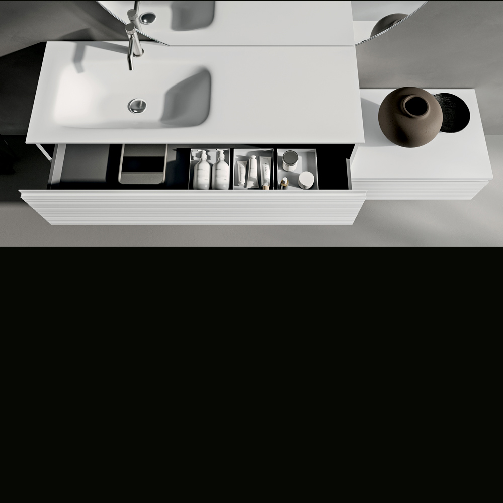 Elegante composizione bagno sospesa dal design essenziale e contemporaneo, pensata per valorizzare ambienti moderni con uno stile luminoso e raffinato.