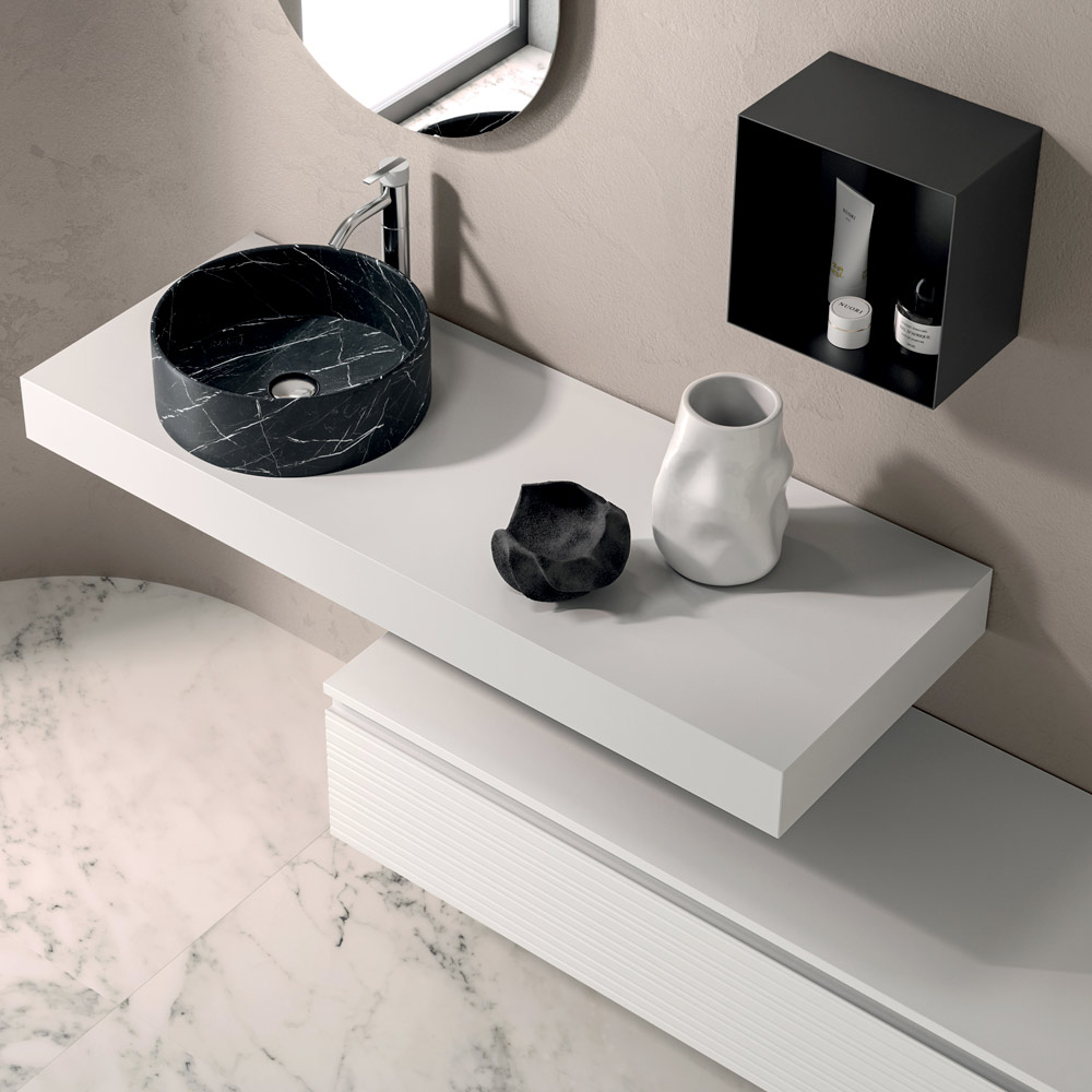 Il top bianco opaco crea una superficie funzionale e versatile, ideale per l’organizzazione degli accessori quotidiani e per arricchire lo spazio con oggetti decorativi, mantenendo un’estetica ordinata e minimale.
