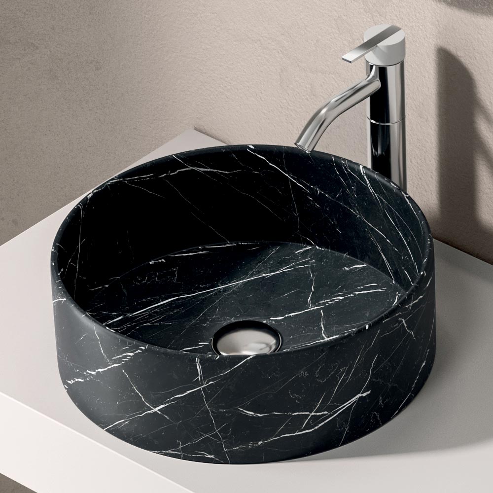 Il lavabo in ceramica effetto Marquina, dalle linee morbide e dal forte impatto materico, introduce un elegante contrasto cromatico che impreziosisce l’insieme e ne sottolinea il carattere sofisticato.