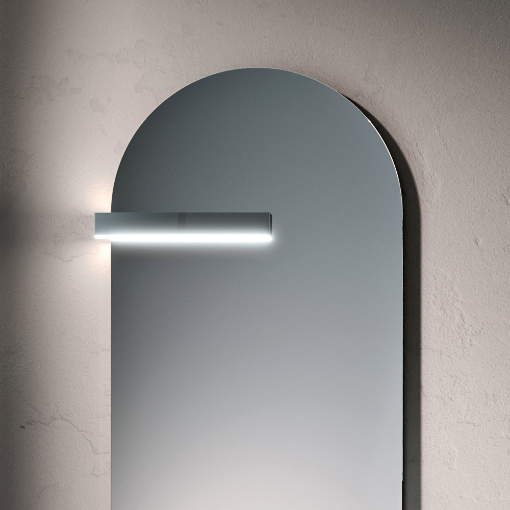 Lo specchio, abbinato all’illuminazione LED decorativa e alla lampada sospesa, completa la composizione creando un’atmosfera intima e ricercata, ideale per un bagno moderno e scenografico.