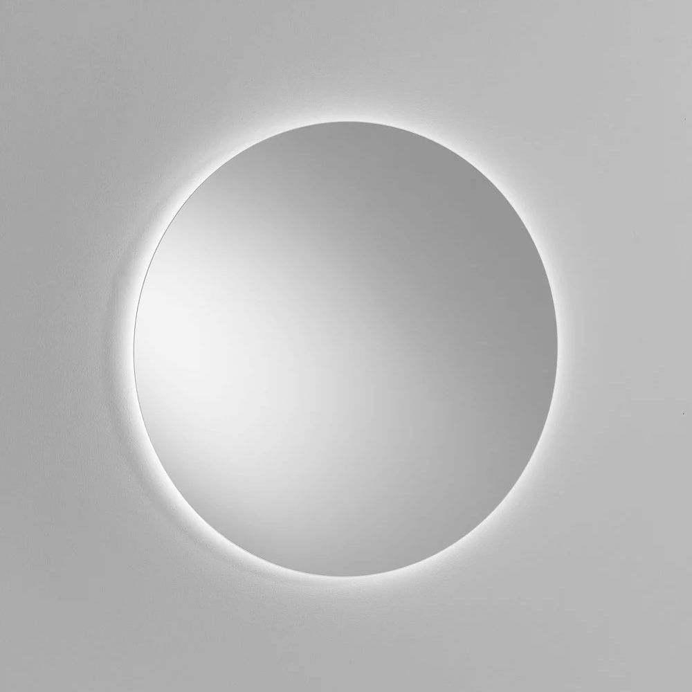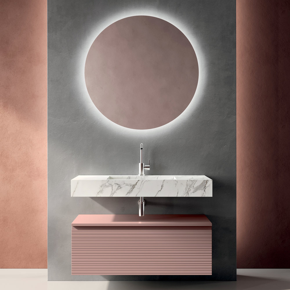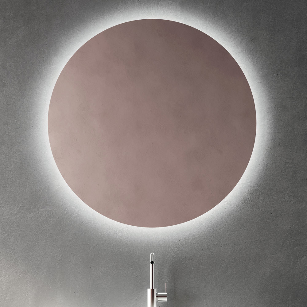 Lo specchio rotondo retroilluminato a LED diventa protagonista della parete, offrendo una luce diffusa e avvolgente che valorizza la zona lavabo e contribuisce a creare un ambiente bagno elegante e scenografico.