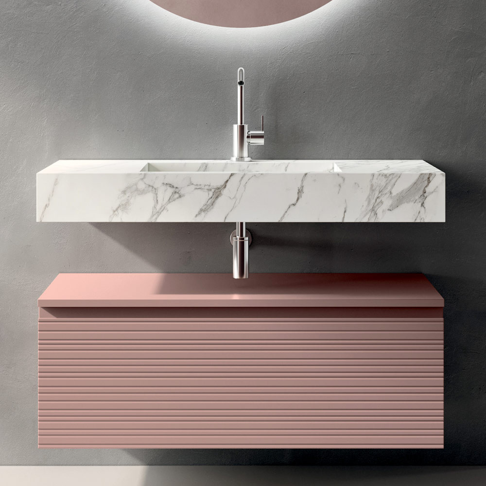 Il mobile bagno sospeso rosa cipria, con cestone ampio e funzionale, offre una soluzione contenitiva pratica ed esteticamente armoniosa. La finitura opaca valorizza il colore con una texture morbida e sofisticata, perfetta per creare un’atmosfera accogliente e luminosa.