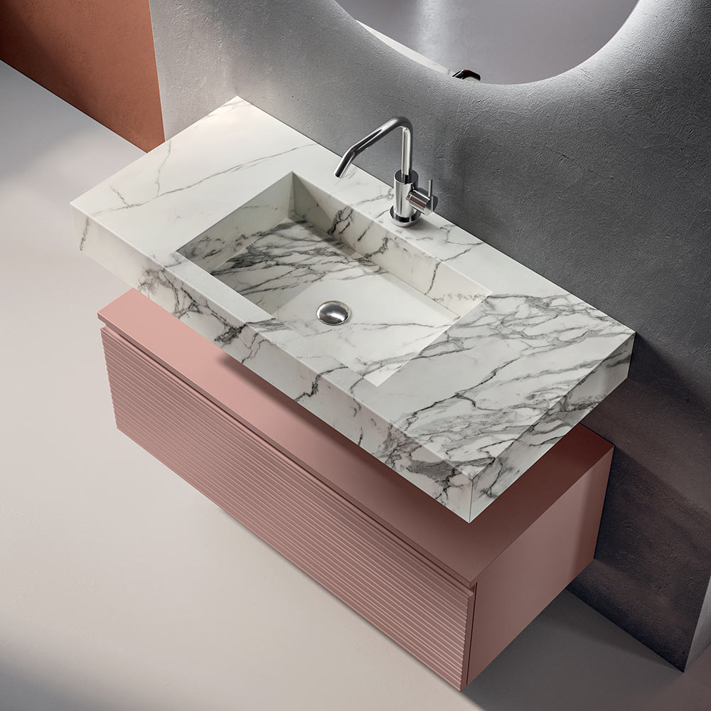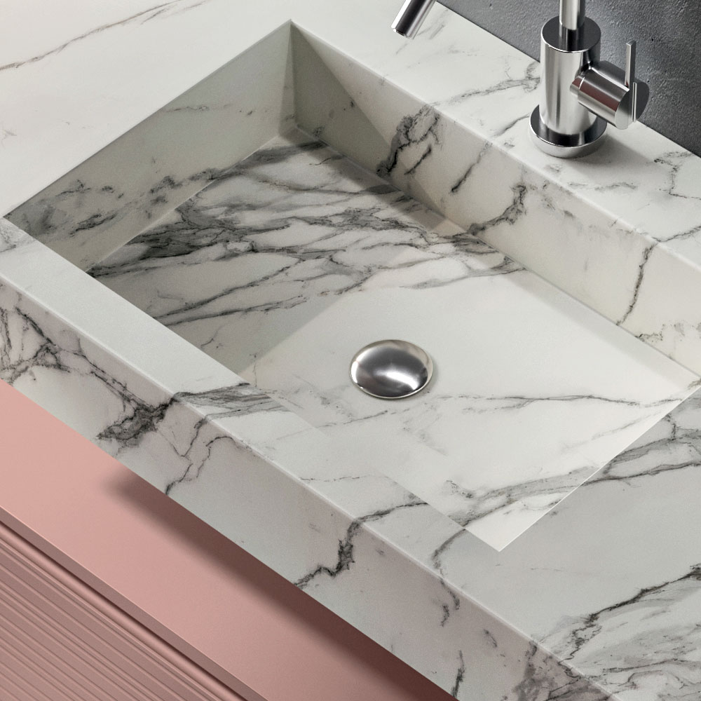 Il top lavabo in HPL effetto Calacatta introduce una nota materica di grande impatto visivo: l’estetica ispirata al marmo dona luminosità e pregio, mantenendo al contempo elevate prestazioni di resistenza e praticità nell’uso quotidiano.