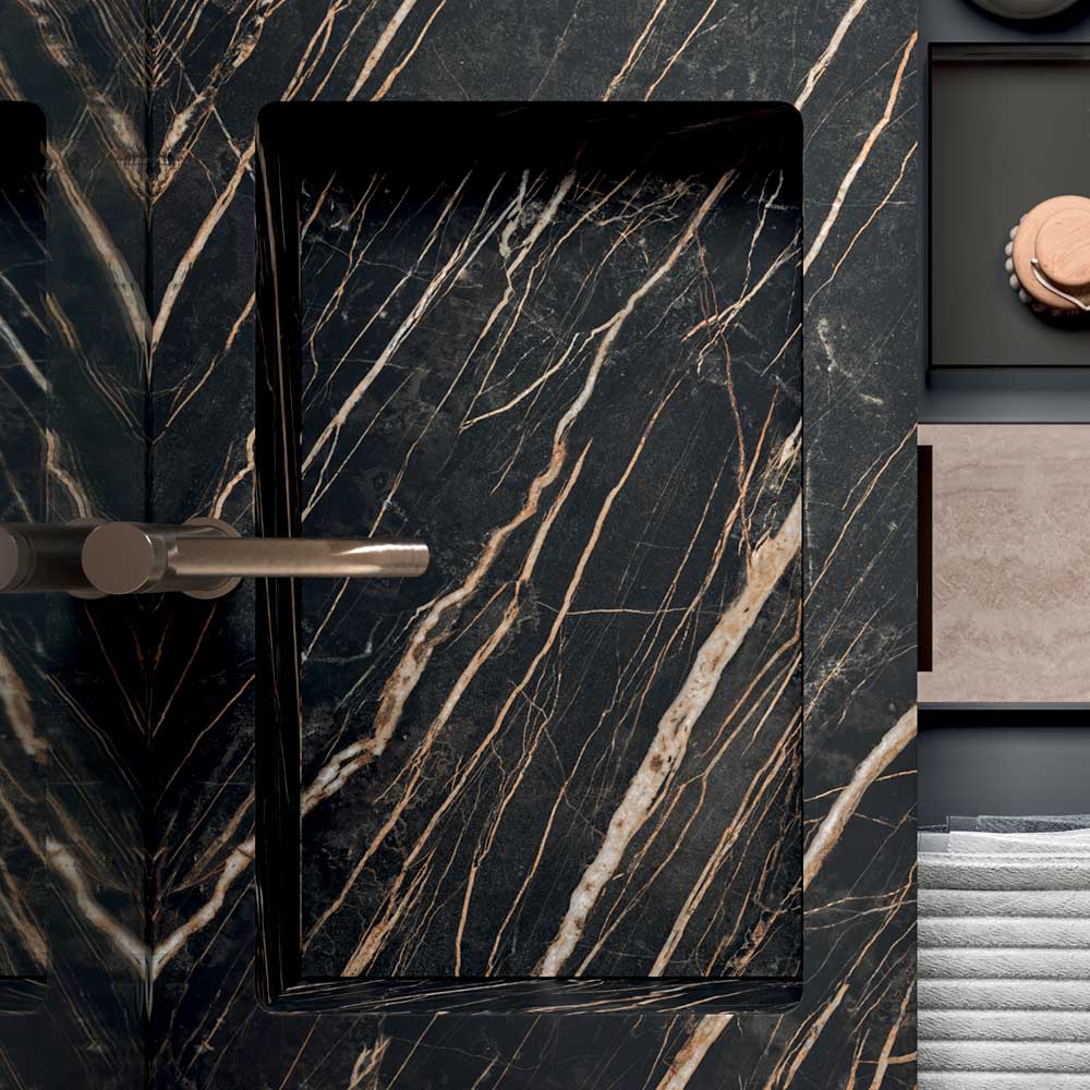 Il lavabo da appoggio in gres, caratterizzato da una finitura scura effetto pietra, aggiunge una forte identità materica e garantisce elevate prestazioni in termini di resistenza e durabilità, rendendolo perfetto per l’uso quotidiano.