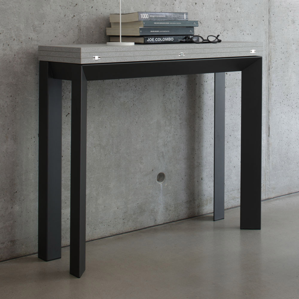 Si presenta con un design pulito e lineare, capace di integrarsi con discrezione in ogni ambiente. Quando è chiusa, è una consolle sottile e raffinata, perfetta per l'ingresso, dove può accogliere oggetti essenziali come chiavi e portafogli, o fare da display per i tuoi oggetti d'arte preferiti.