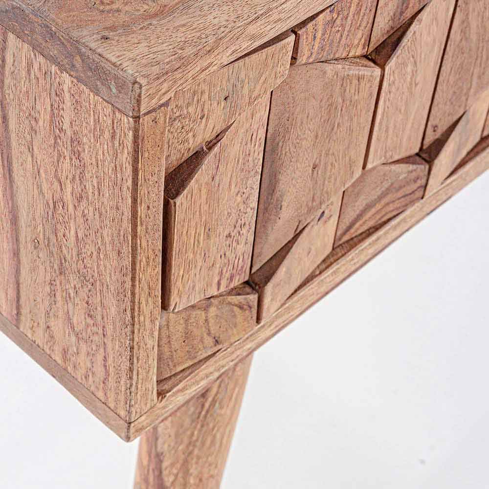 Questa consolle di design è realizzata in pregiato legno sheesham dalla finitura naturale. Si tratta di un legno di media-grossa consistenza noto per la sua naturale lucentezza; per questo e per la sua durevolezza nel tempo risulta ideale nella produzione di mobili. Progettata con due cassetti dallo schienale ed il fondo in compensato con finitura naturale, mentre la parte frontale è decorata. Completano la scena gli eleganti pomelli in acciaio.
