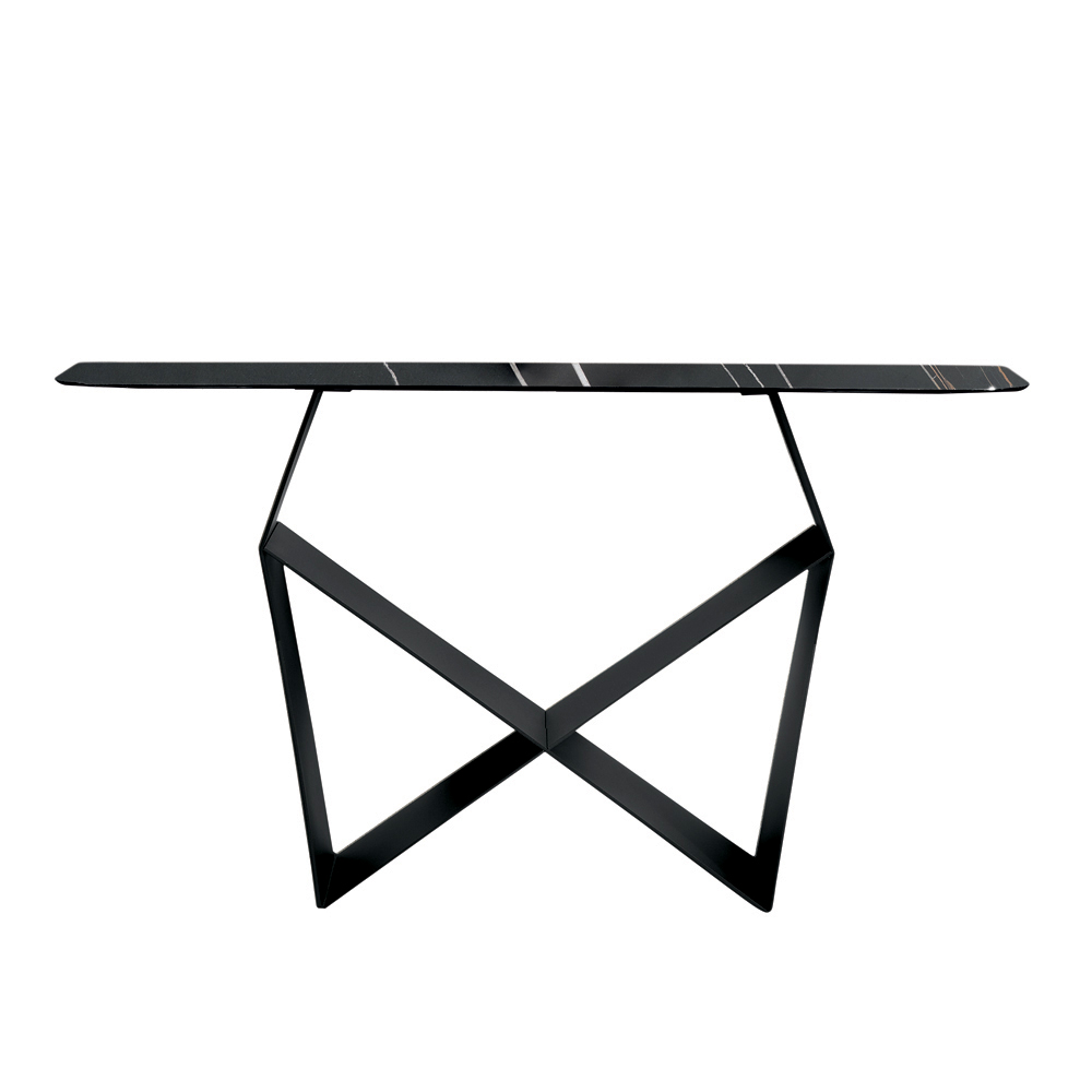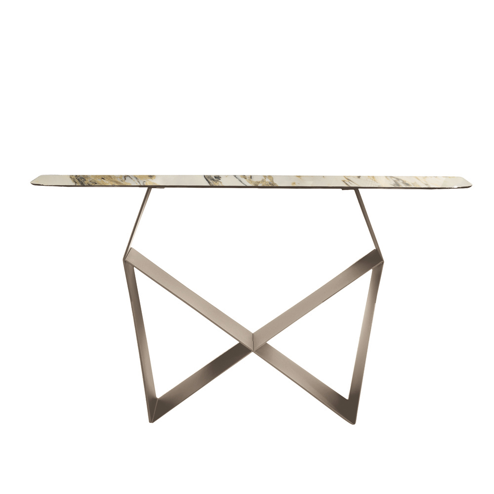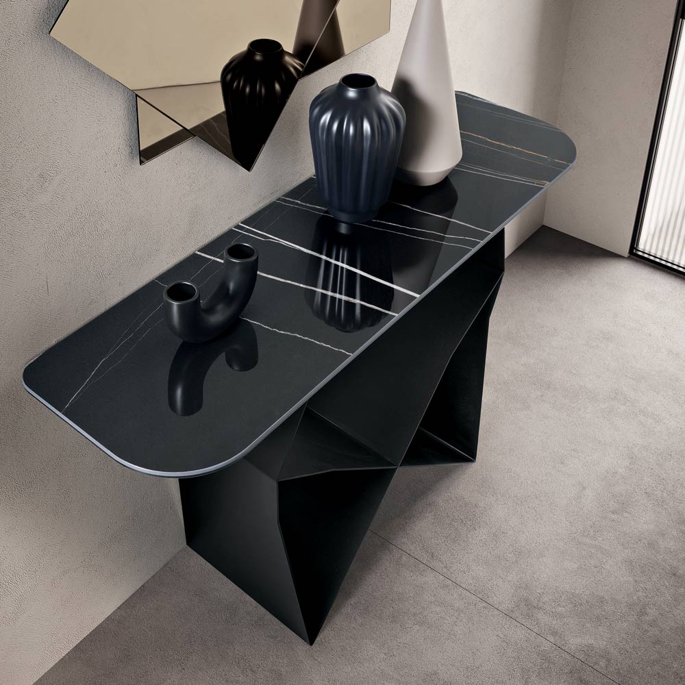 La struttura si distingue per il suo basamento in metallo verniciato che disegna un’originale forma a papillon, creando un raffinato gioco tra pieni e vuoti. Questo dettaglio dona dinamismo e slancio alla composizione, conferendo alla consolle una presenza scenografica ma equilibrata.