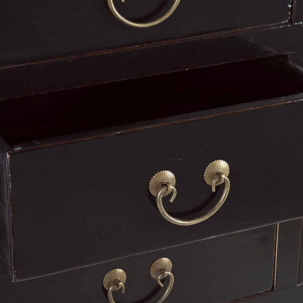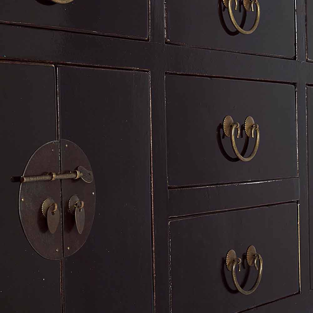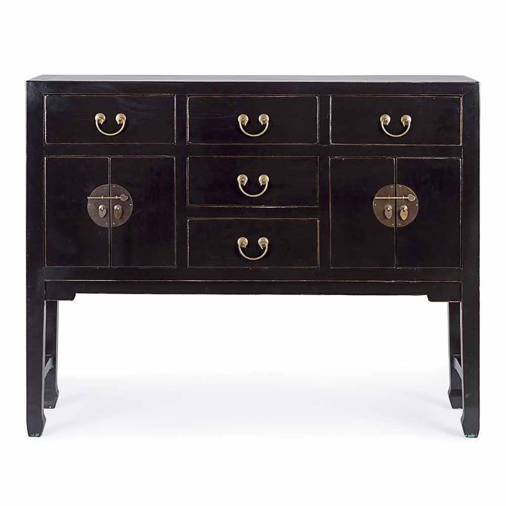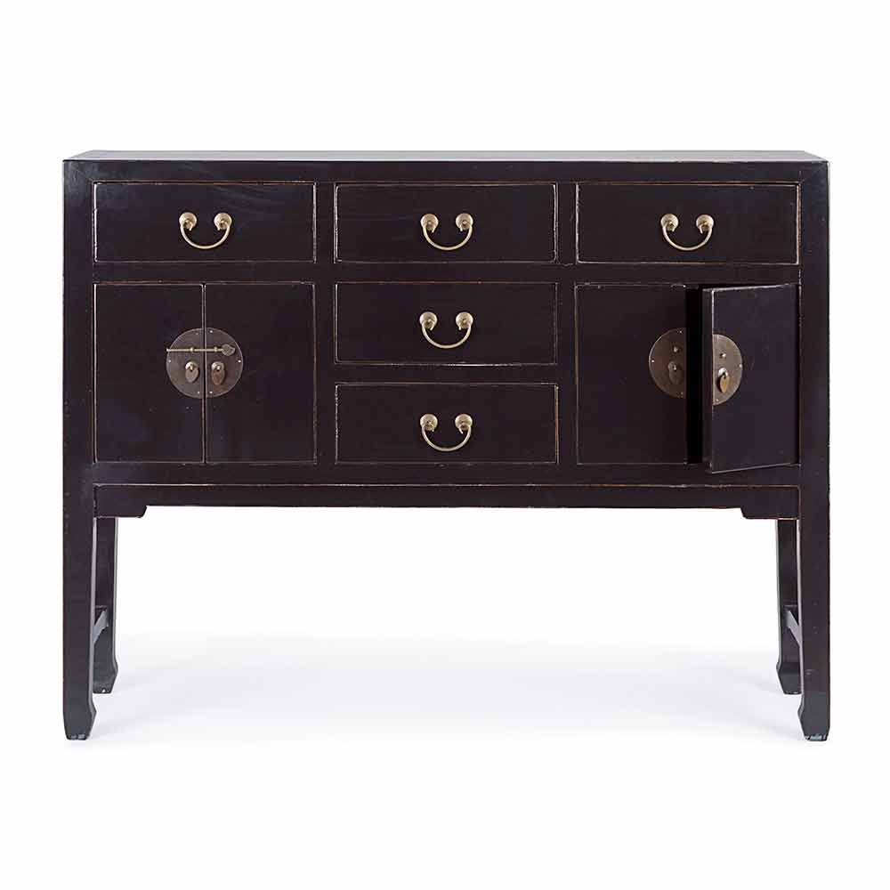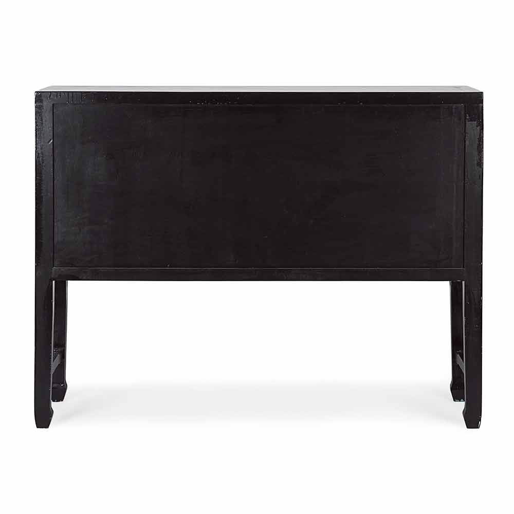Consolle nera in legno di olmo a 5 cassetti e 4 ante di design vintage.