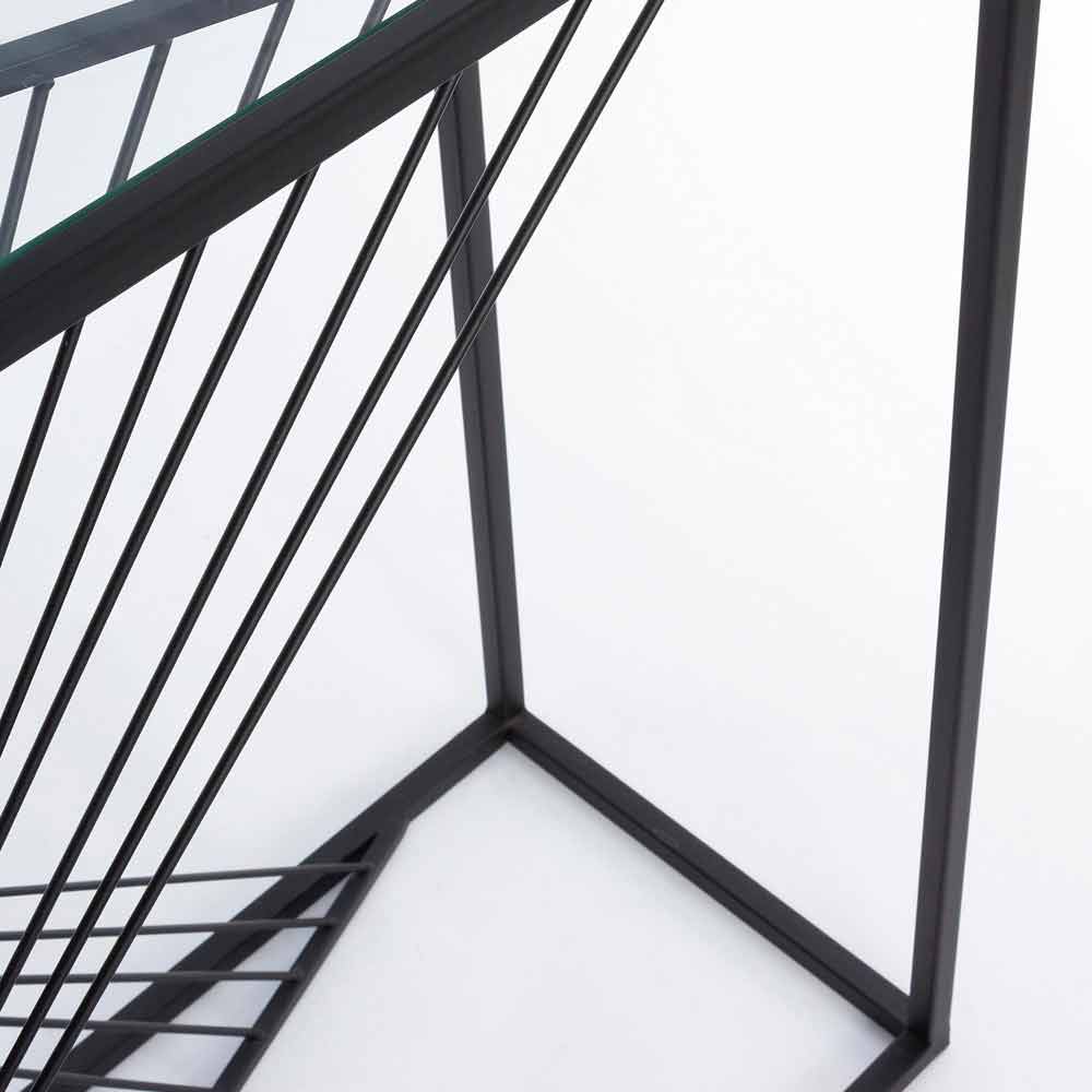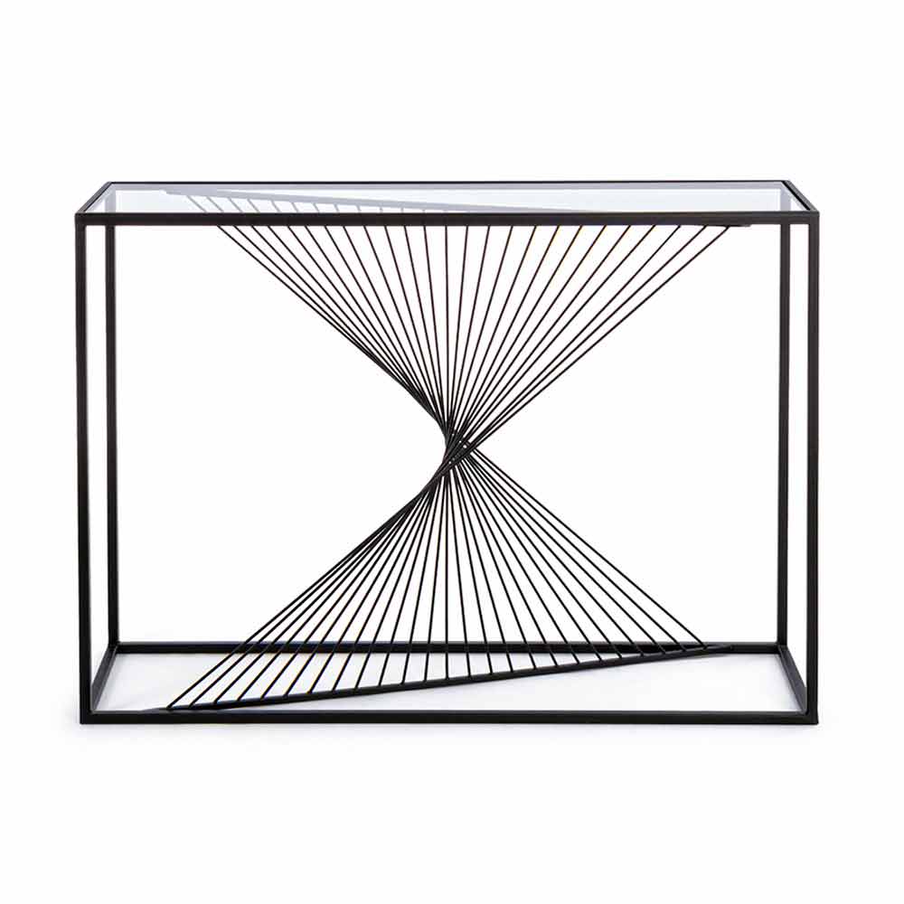 Questa consolle di design presenta una struttura minimale rettangolare in acciaio verniciato a polvere epossidica ed un piano in vetro temperato.