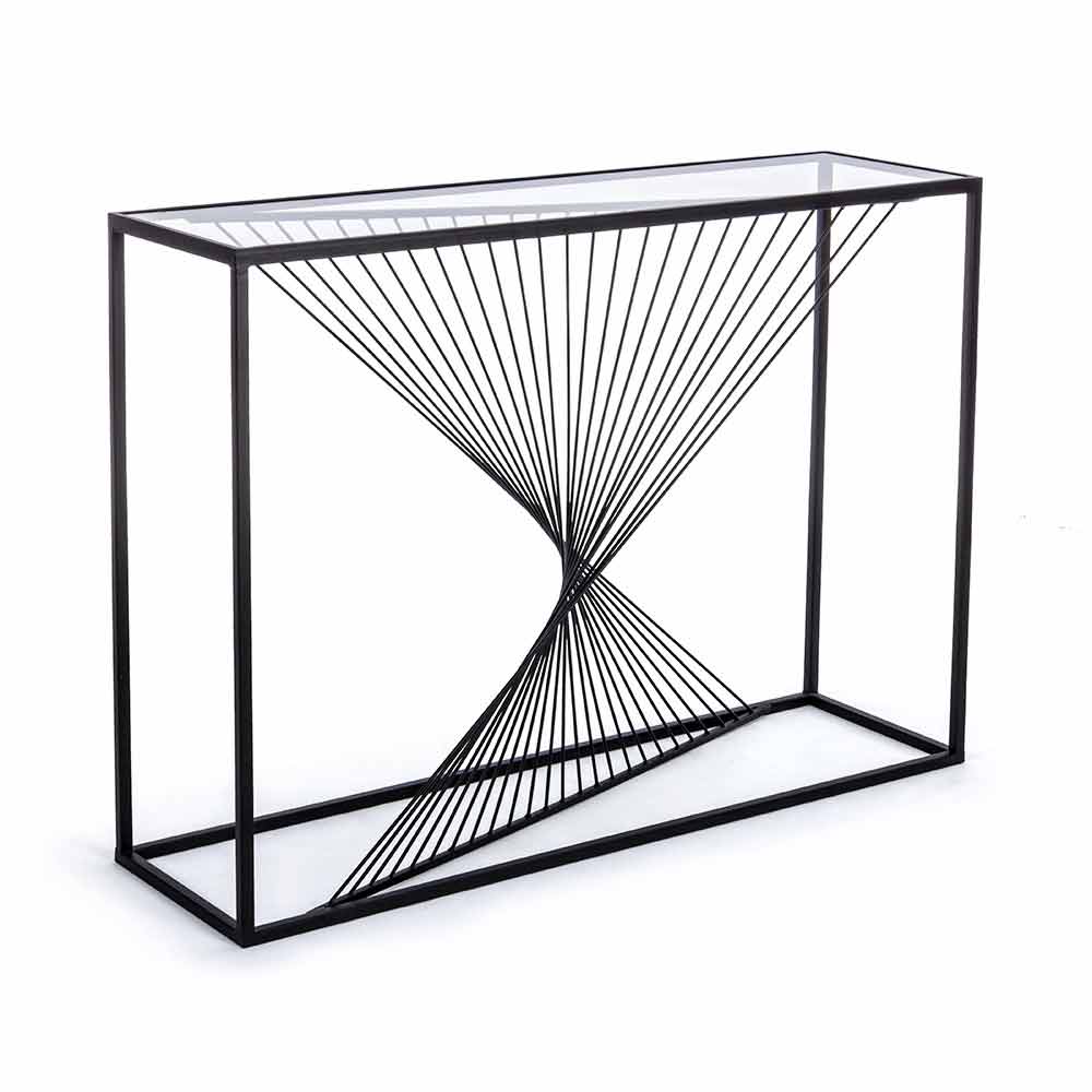 Consolle rettangolare moderna in acciaio e vetro di design con gioco di forme.