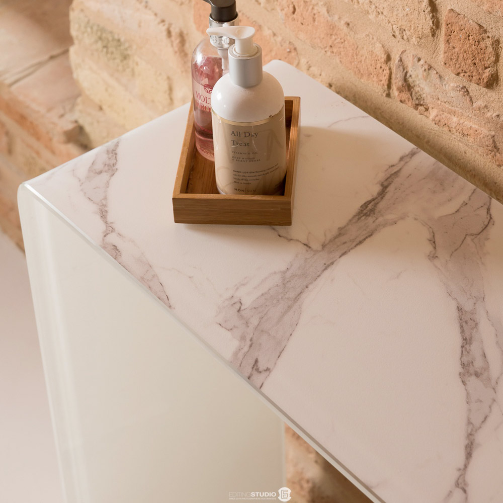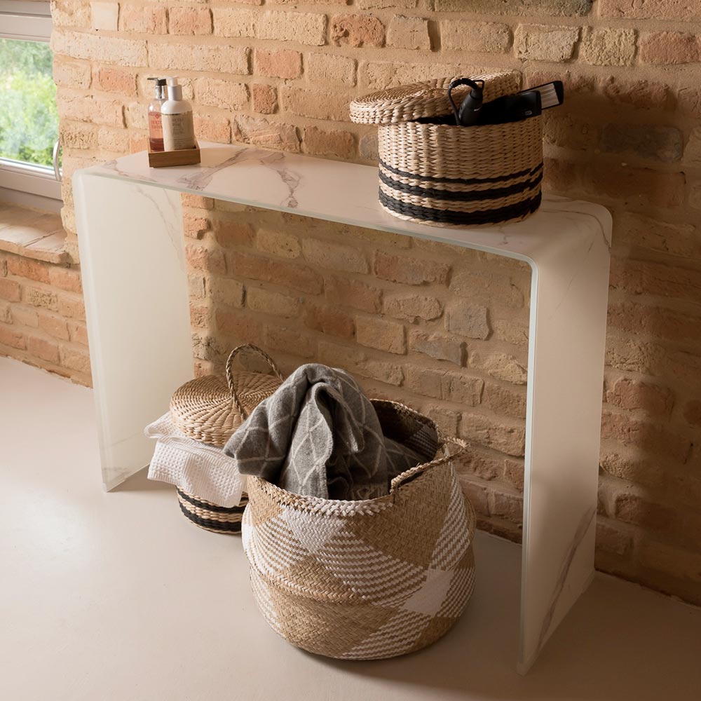 Questa consolle dal design elegante e contemporaneo è realizzata in vetro curvato temperato da 10 mm con raffinata finitura effetto marmo, che dona all’ambiente un tocco sofisticato e luminoso. La struttura monolitica valorizza l’estetica essenziale del prodotto.