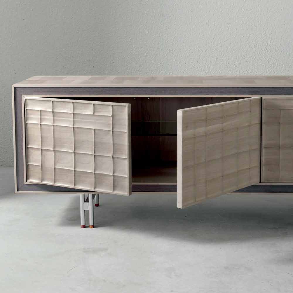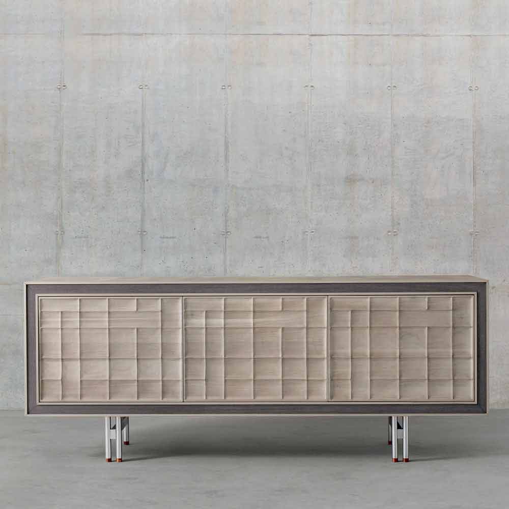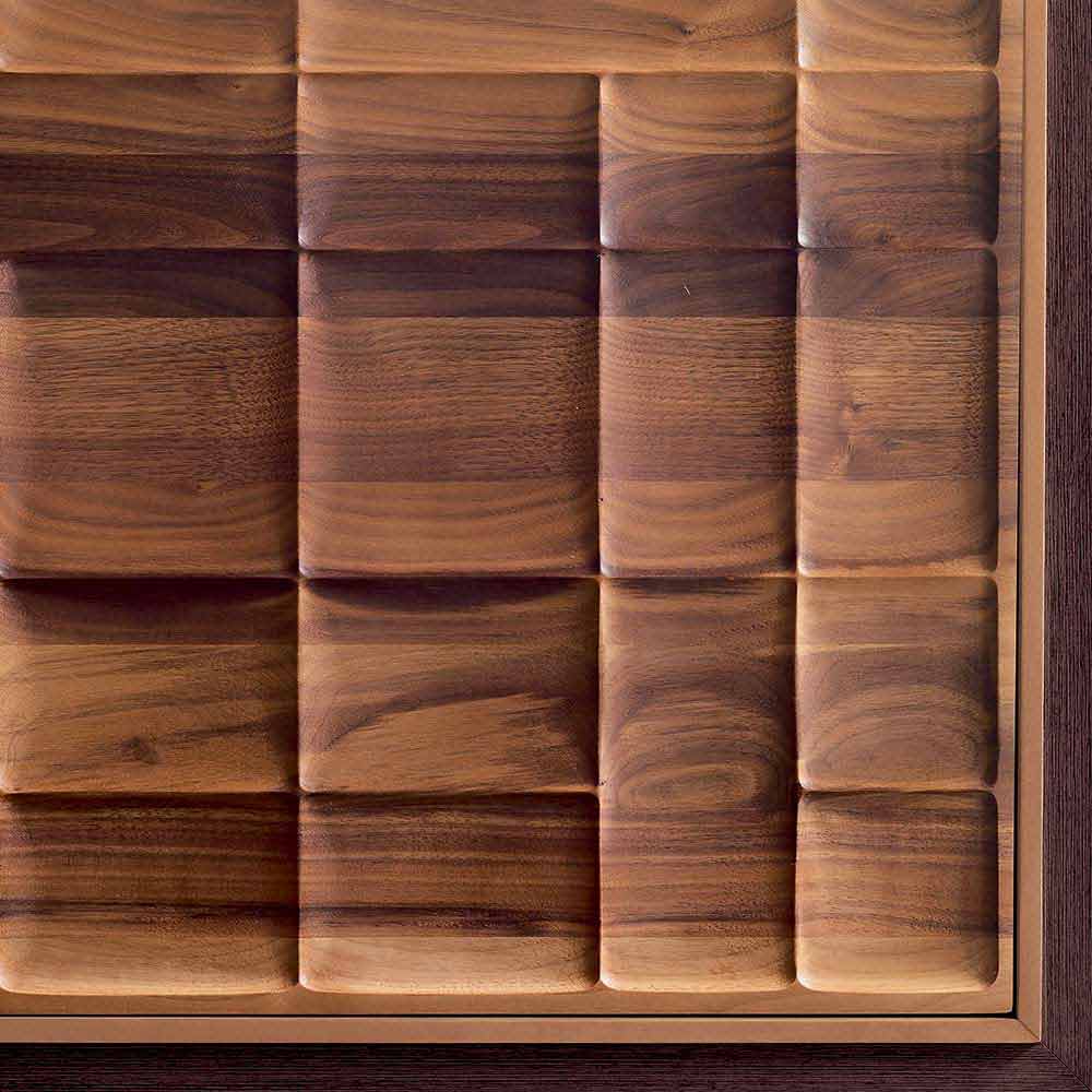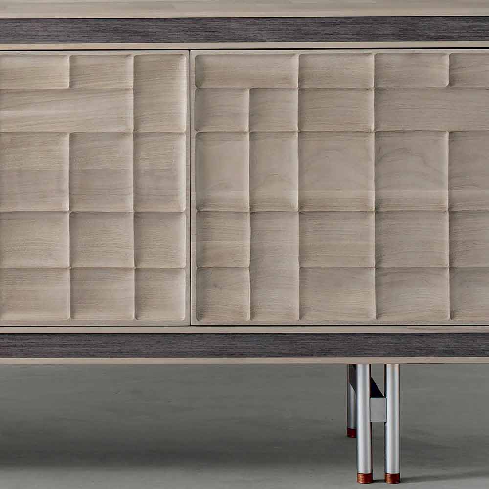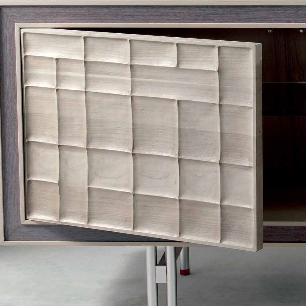 Il gioco di luci e di ombre creato dalla particolare lavorazione delle ante riprende i tratti della tradizione per trasformarli in un'opera della contemporaneità. L'essenza in noce esalta l'equilibrio formale della pregevole credenza a tre ante.