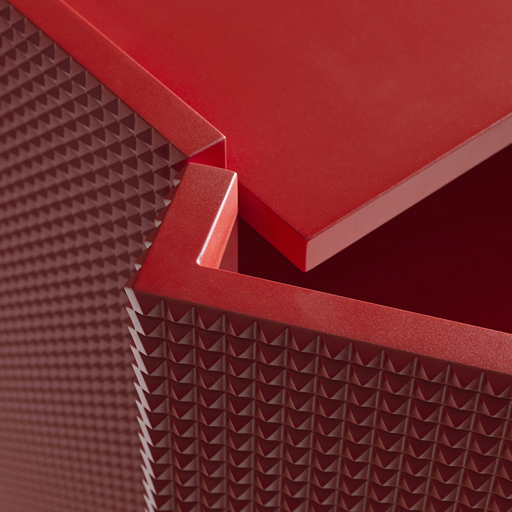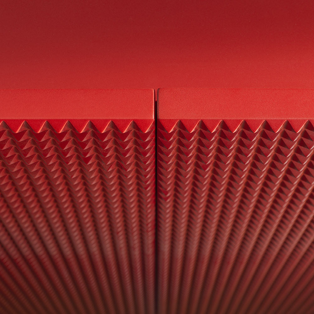 Un arredo scultoreo che unisce matericità e raffinatezza, in perfetto equilibrio tra estetica e funzionalità. Questa credenza a due ante si distingue per l’iconica finitura “a diamante” arancio/rosso, una lavorazione tridimensionale dal forte impatto visivo, carteggiata a mano prima della laccatura finale per ottenere una superficie vibrante ed estremamente sofisticata.
