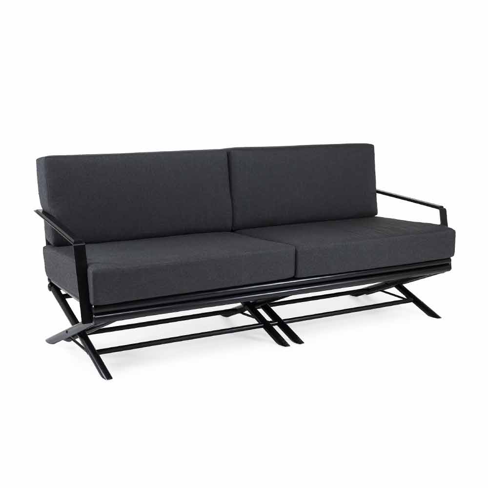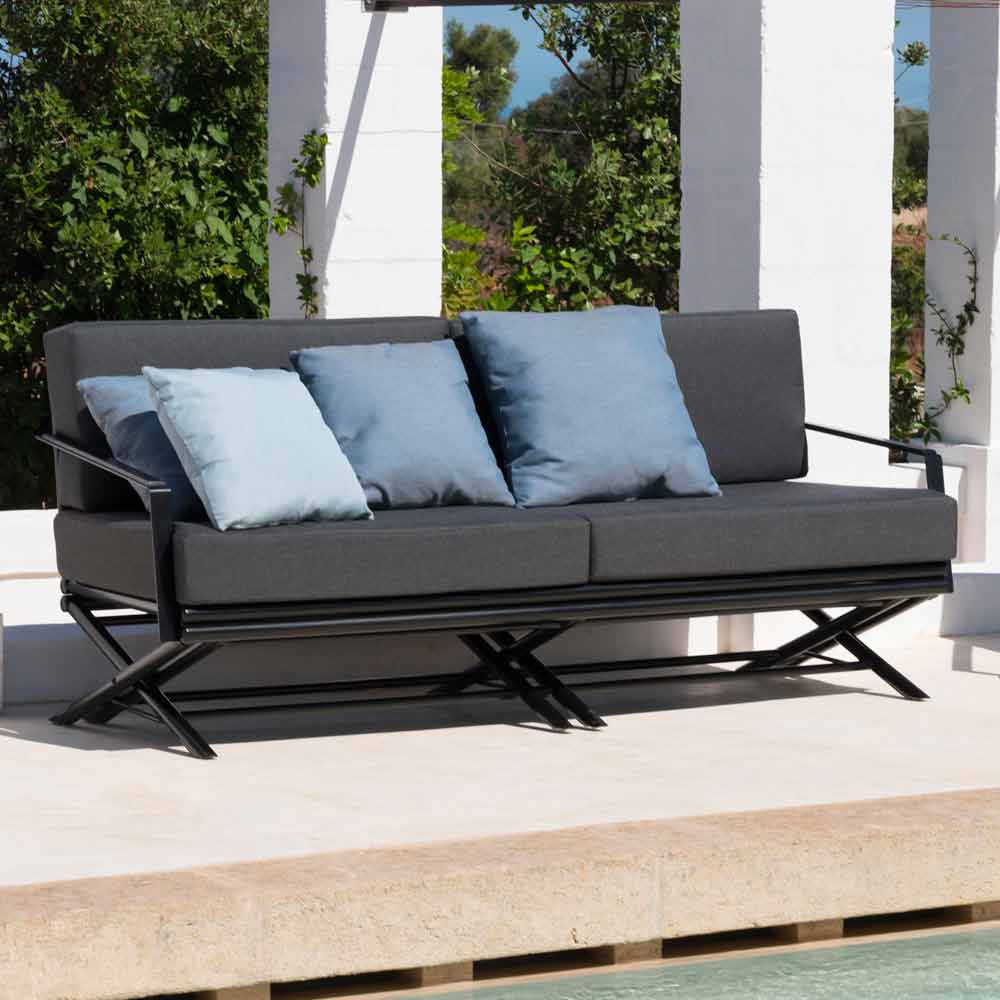 Divano da esterno 3 posti realizzato in legno naturale o nero e cuscini in tessuto, design di lusso made in Italy.