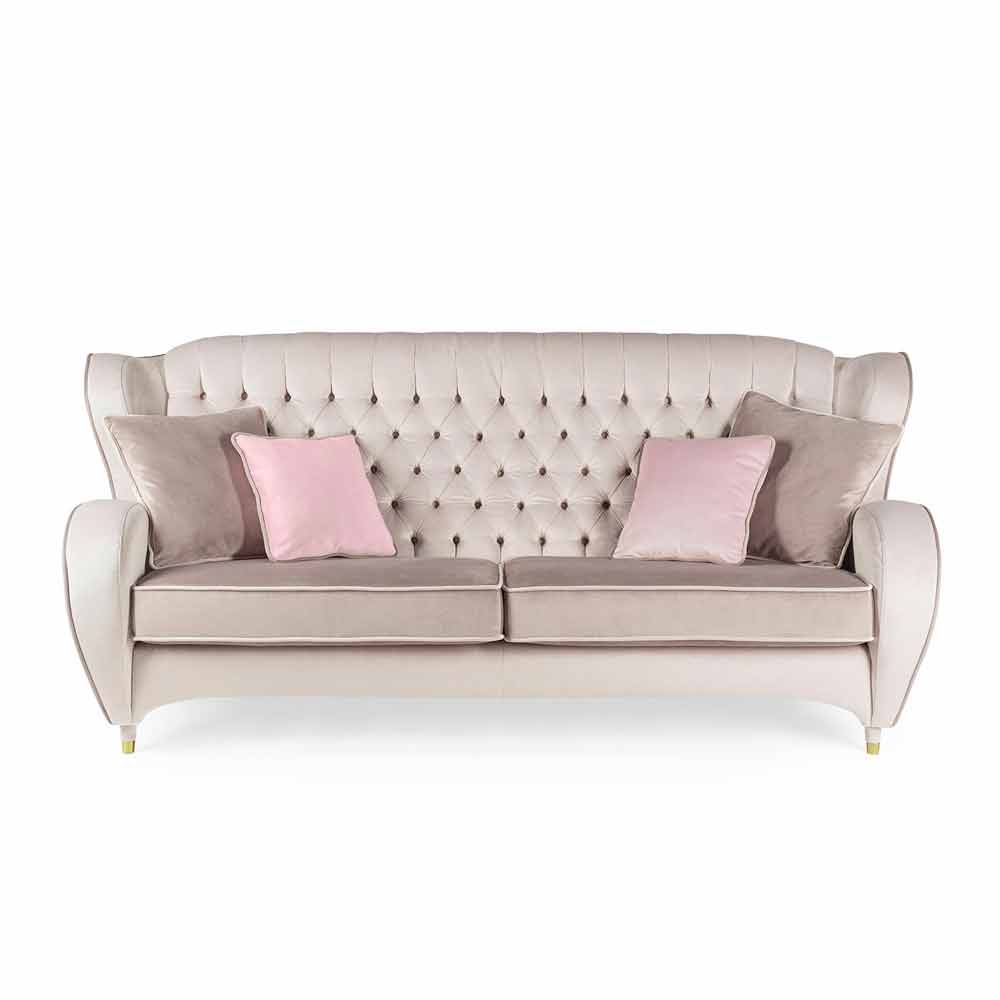 La peculiarità di questo divano è racchiusa nel suo prezioso rivestimento in velluto liscio e morbido, dalle nuances delicate Ecru e Tortora e bordo canaletto. Divano in stile New Classic con schienale alto nella lavorazione capitonnè.