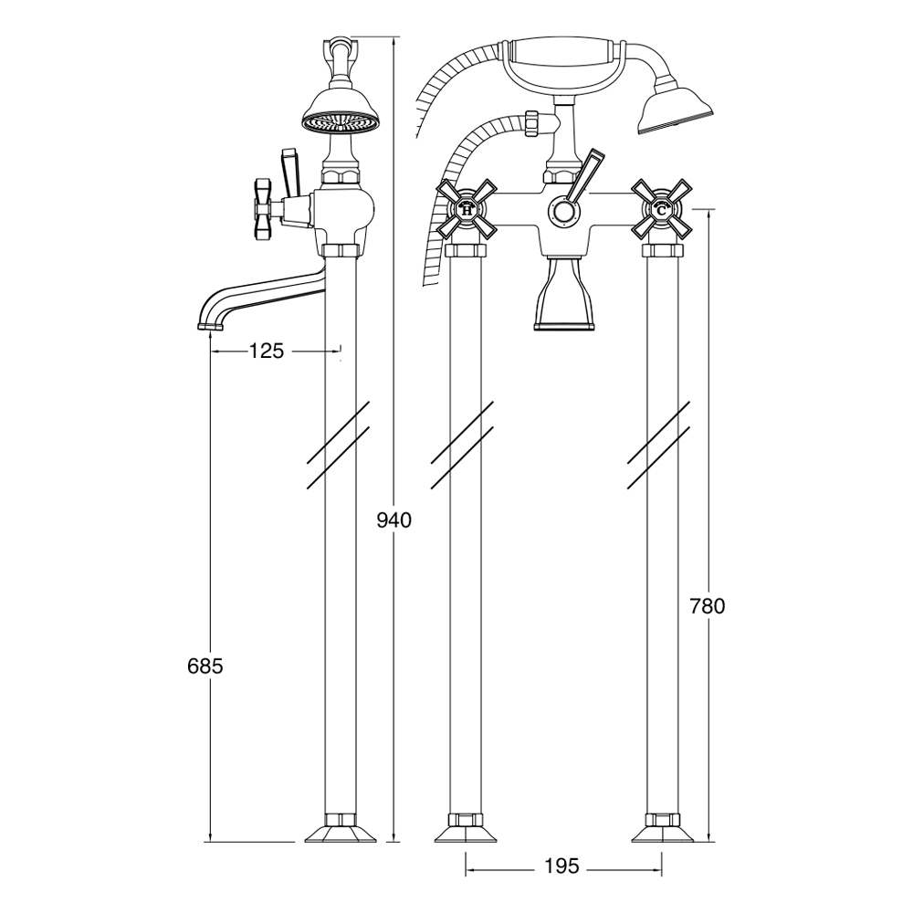 gruppo vasca da pavimento con doccietta e flessibile, realizzato in ottone.