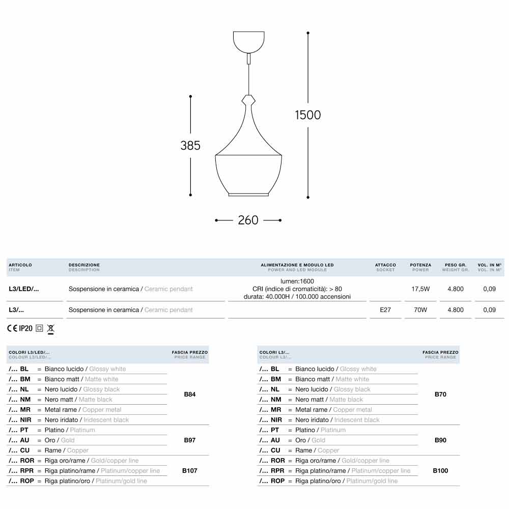 Disponibile in diverse finiture e con attacco standard E27 oppure LED.