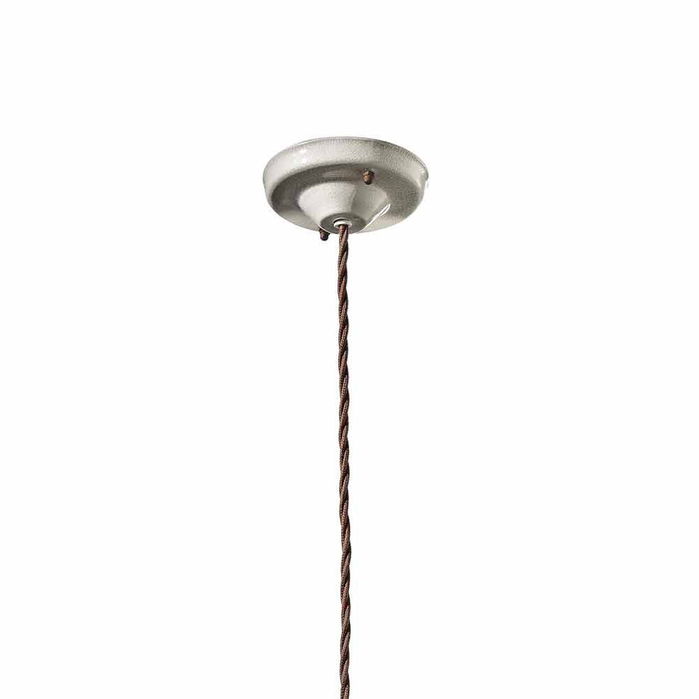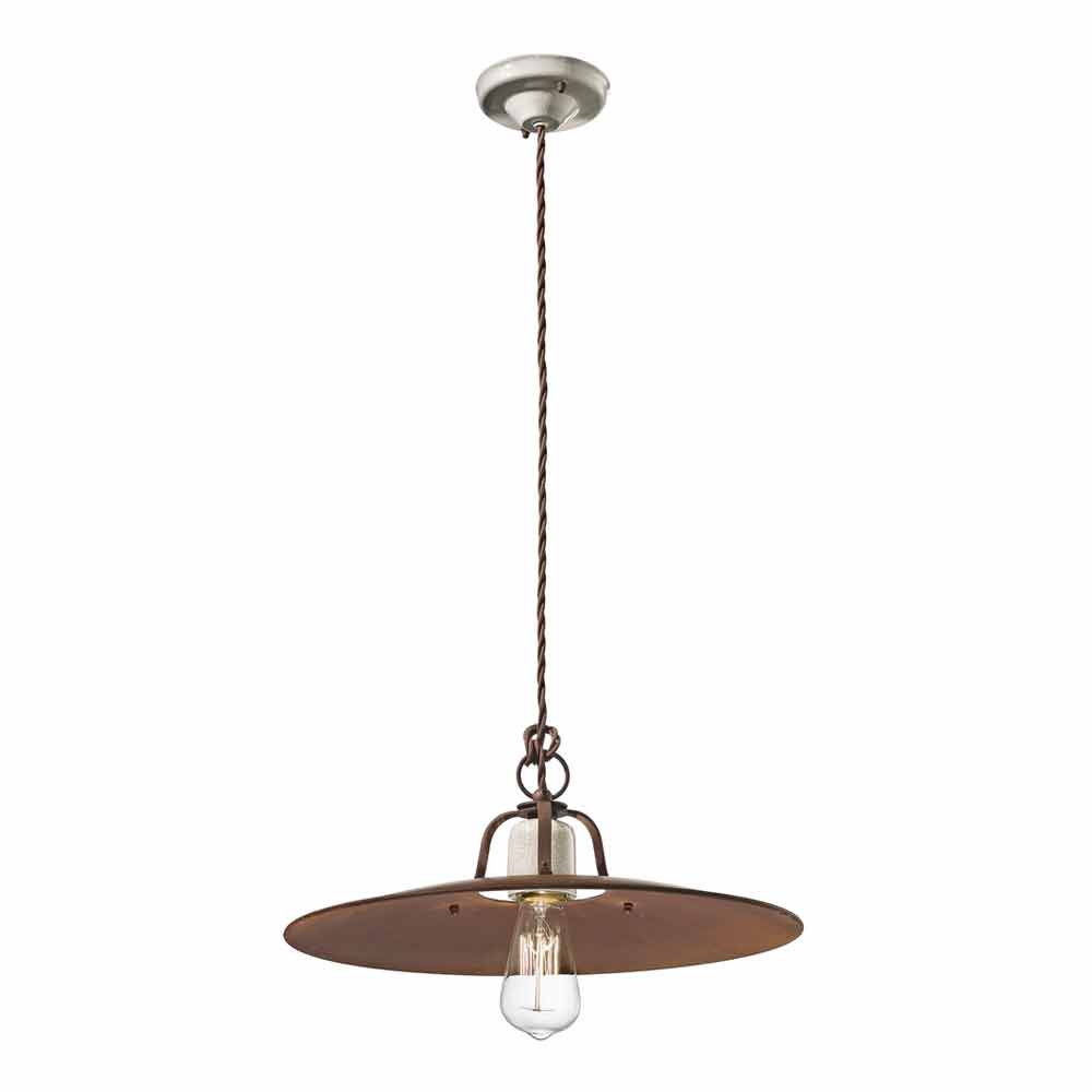 Corona ampia e altezza facilmente regolabile grazie al cavo intrecciato che ne completa lo stile industrial. Metallo ruggine opaco e dettagli in ceramica per completare un equilibrio di forme piene e vuote. Si ispira allo stile rustico americano. Questa lampada, dai colori poco accesi e dal sapore vissuto, è semplice e senza tempo. Luce pura priva di schermature.